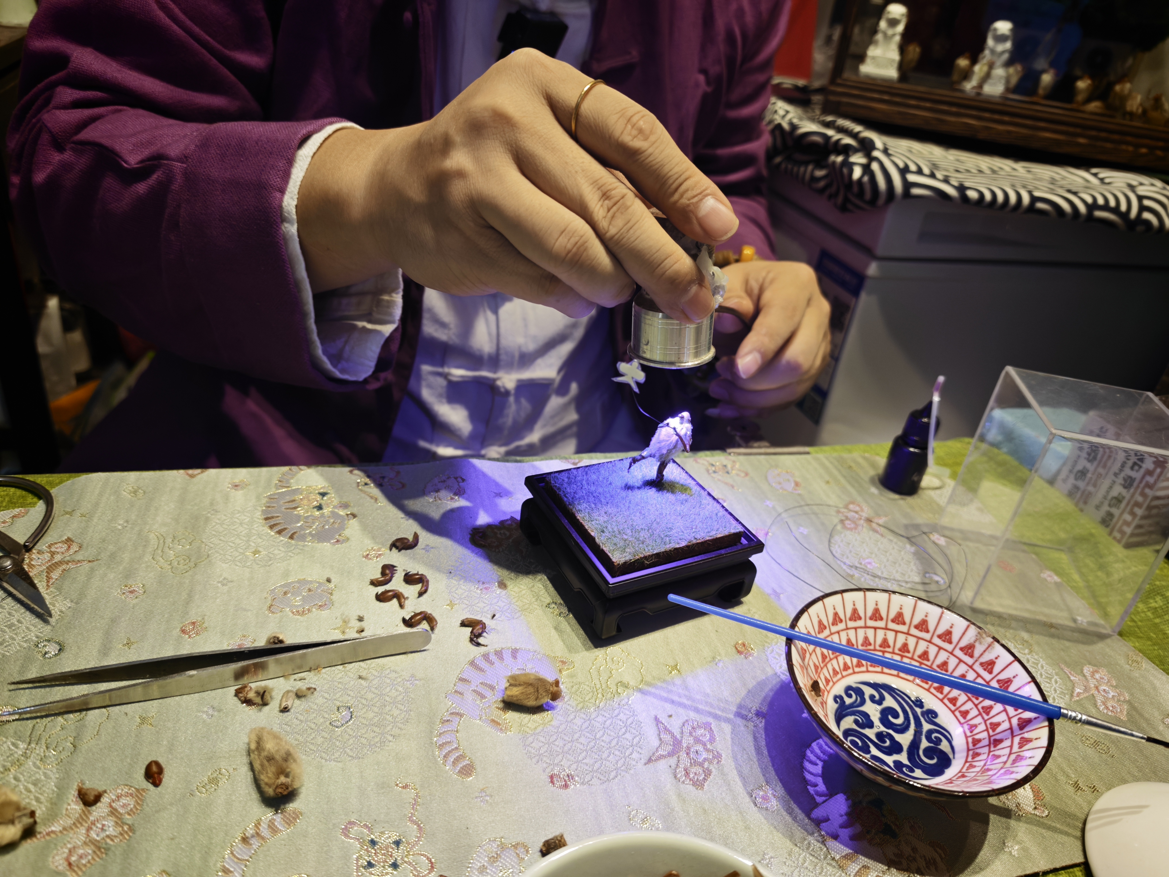 在韩僖僖手下,材料的选择也更为多样:食盐模拟白雪,海绵经揉碎上色变成繁茂枝叶;超轻黏土、环氧树脂、雪弗板乃至美甲用品这些生活中常见的物品,在他手中都化身为栩栩如生的场景元素。