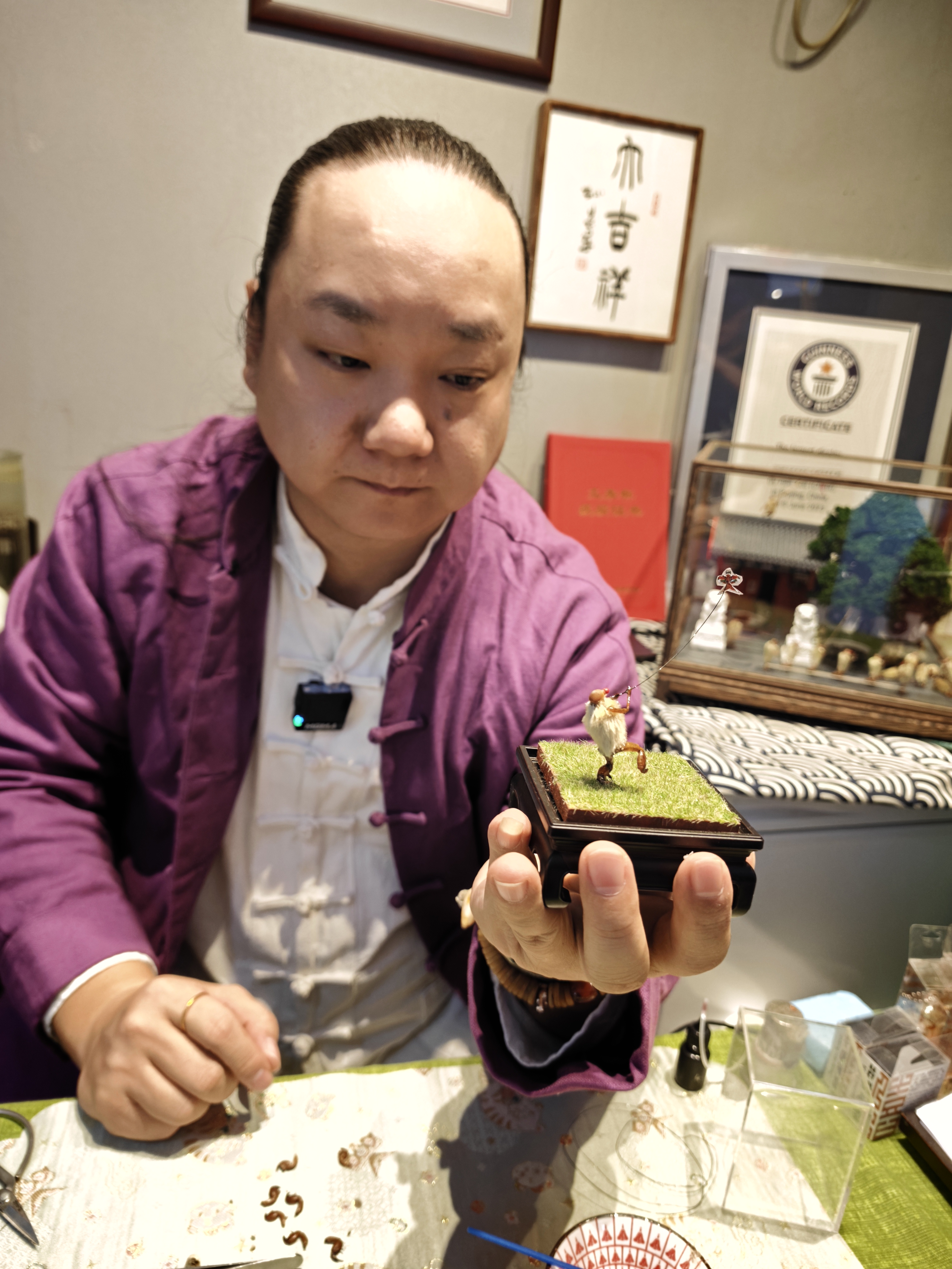 “我的毛猴都没有名字也没有面孔,他们是大千世界,也是芸芸众生,他们就是你我他。”作为北京市级非物质文化遗产项目毛猴第四代传承人,韩僖僖一直在尝试寻找传统技艺和现代人的情感共鸣,为非遗传播打开新思路。他用铜丝穿过毛猴关节,每调整一个动作拍摄一张照片,拼接成定格动画,让毛猴跟着音乐“跳”起毽子舞。他还通过AI技术生成毛猴放风筝、贴秋膘、斗蟋蟀等动态视频,开发了毛猴钥匙链、冰箱贴等文创产品,让非遗融入日常生活。“希望通过我的努力,用现代科技为传统技艺搭一座桥,让更多人了解毛猴、喜欢毛猴。”韩僖僖说。