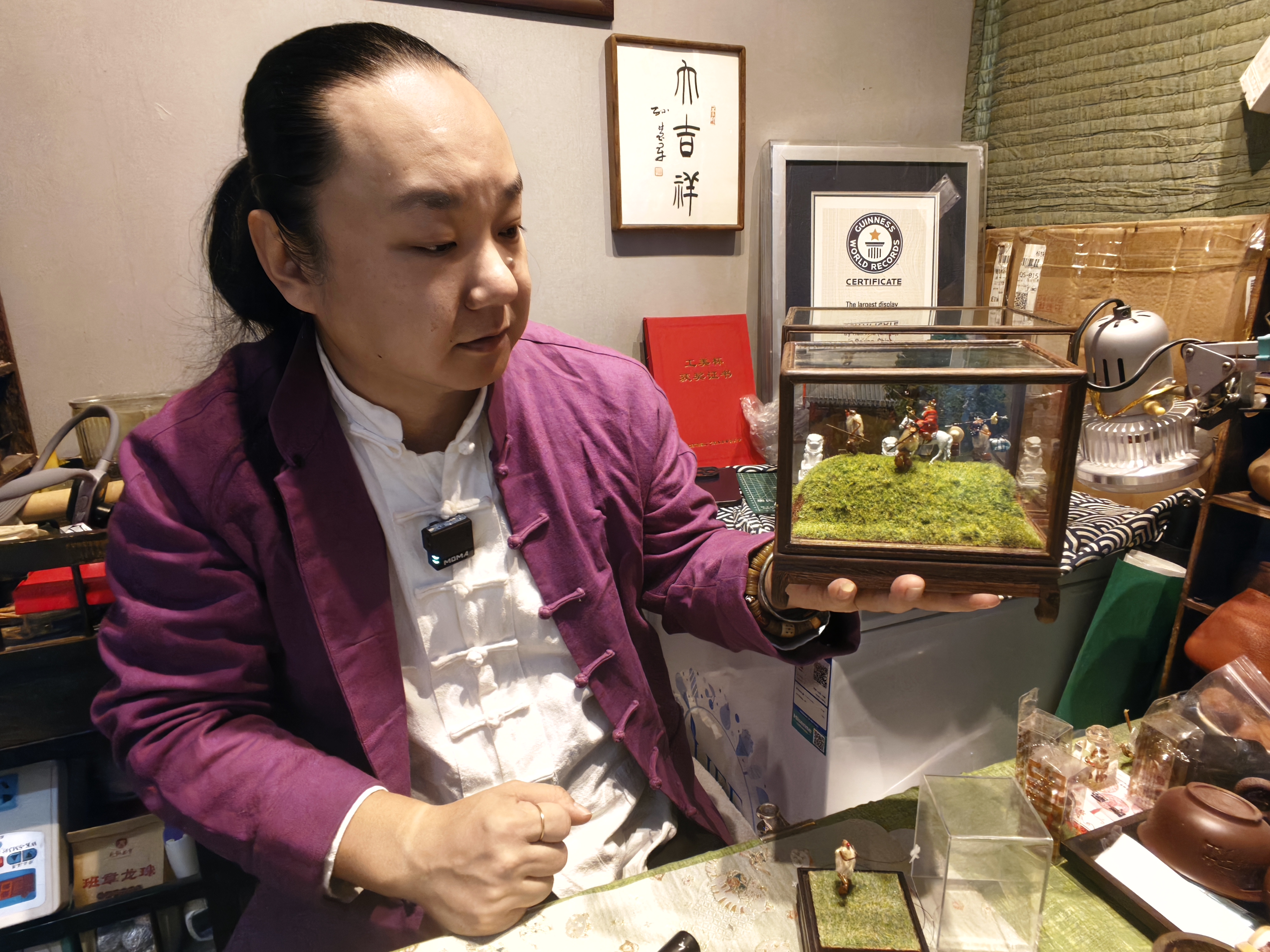 放在工作室显眼位置的作品《立夏》,是韩僖僖二十四节气系列作品中的一个。32只毛猴鲜活灵动,无一重样,它们或下棋对弈,或弹珠嬉戏,或静心读书,或屏息捉蝉……夏日的童趣和老北京胡同里的烟火气,在不大的玻璃盒中展现得淋漓尽致。