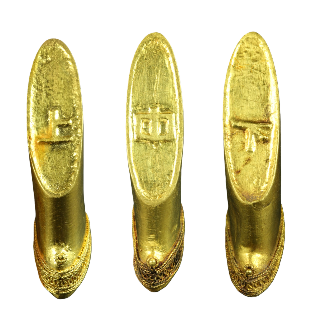 此外,展览中展出的褭蹏金(俗称“马蹄金”)与麟趾金,以花丝镶嵌工艺铸就,其底部“上”“中”“下”铭文暗藏等级秩序。通俗地说,褭蹏金、麟趾金是汉武帝时代象征祥瑞的特制纪念币,常被用于赏赐亲信或功臣。