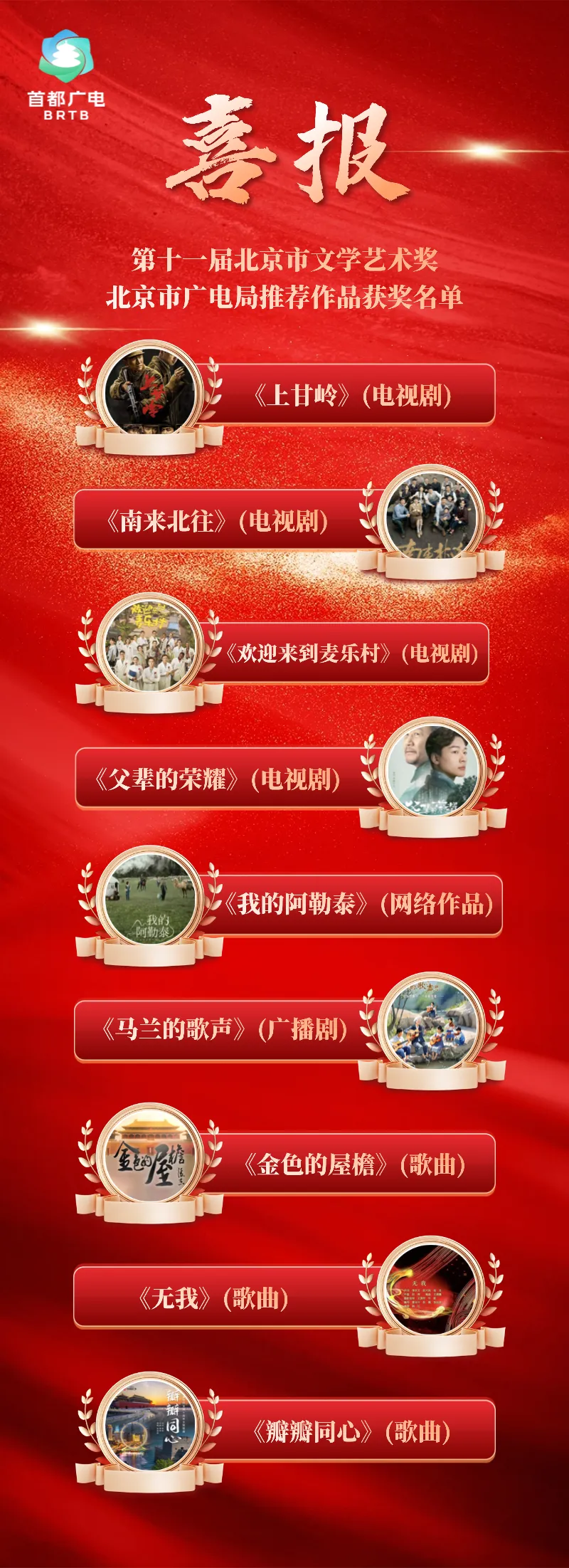 其中,北京市广电局“北京大视听”重点文艺精品项目电视剧《上甘岭》《南来北往》《欢迎来到麦乐村》《父辈的荣耀》、网络作品《我的阿勒泰》、广播剧《马兰的歌声》、歌曲《金色的屋檐》《无我》《瓣瓣同心》9部作品获奖。
