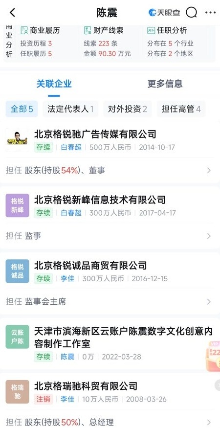 天眼查显示,陈震名下共关联5家企业,其中4家为存续状态,包括北京格锐驰广告传媒有限公司、北京格锐新峰信息技术有限公司等,陈震在上述企业中担任股东、董事、监事等职务。其担任股东的北京格锐驰广告传媒有限公司现存1则欠税公告,在今年10月由门头沟区税务局发布,欠税金额为2965.14元,欠税税种为印花税。