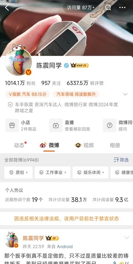 公开资料显示,陈震为车评人、汽车评测类节目《萝卜报告》创始人,曾为汽车之家员工。截至12月5日,其微博账号发博近7万条,粉丝数达1014.1万。记者在微博页面搜索看到,陈震个人账号@陈震同学因违反相关法律法规,目前处于禁言状态,其快手平台、小红书平台等账号也处于封禁中。