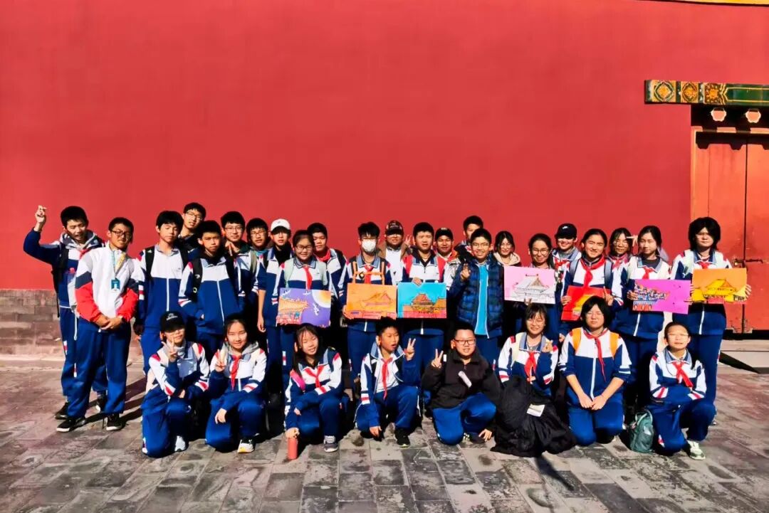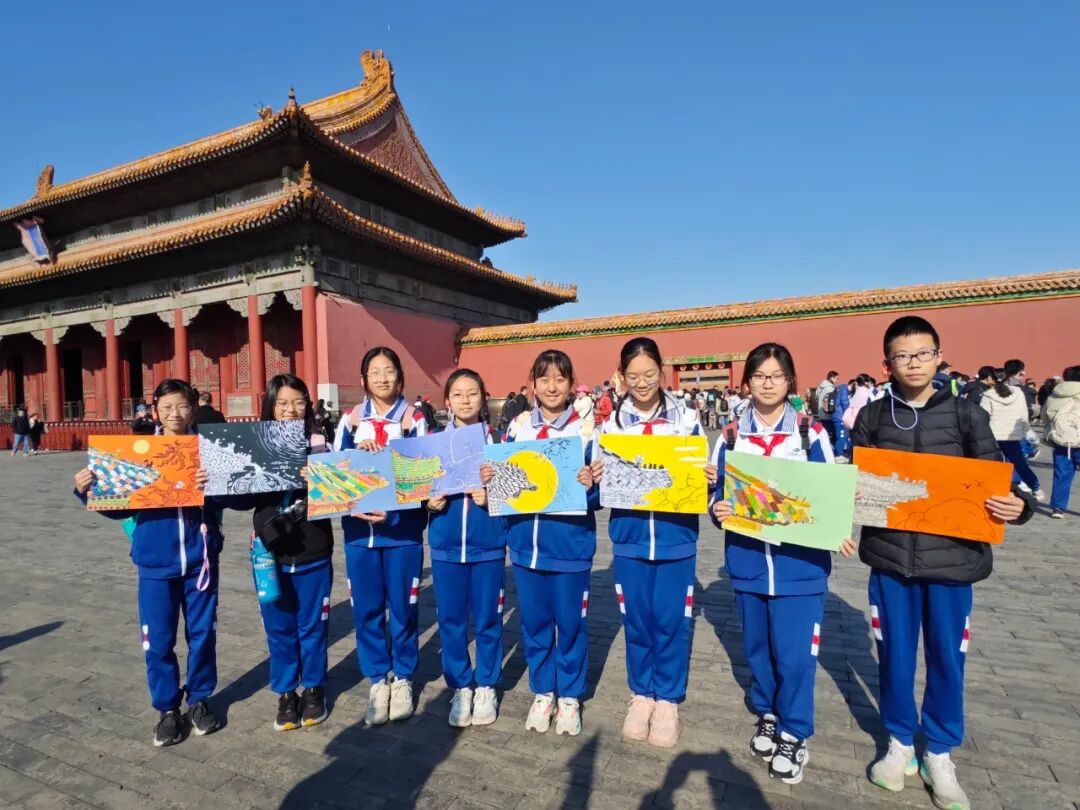 怀着对历史的敬畏,初二学子走进故宫这座文明宝库。太和殿的雄浑、御花园的清雅,红墙黄瓦的威仪、雕梁画栋的精巧,都成为他们观察的焦点。驻足文物前探寻匠心,漫步宫殿间感受历史,穿梭廊道中聆听轶事,更以画笔勾勒宫阙风华,将朱墙金顶、飞檐斗拱凝于尺幅之上,携亲手绘制的美术作品与千年故宫合影定格 —— 这堂行走于宫阙间的实践课,让传统文化从课本文字变为可触可感的印记,也为演讲积累了鲜活素材。