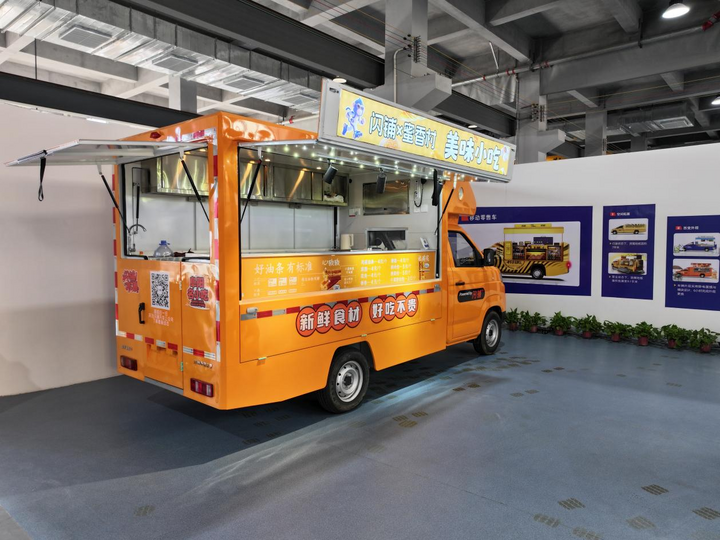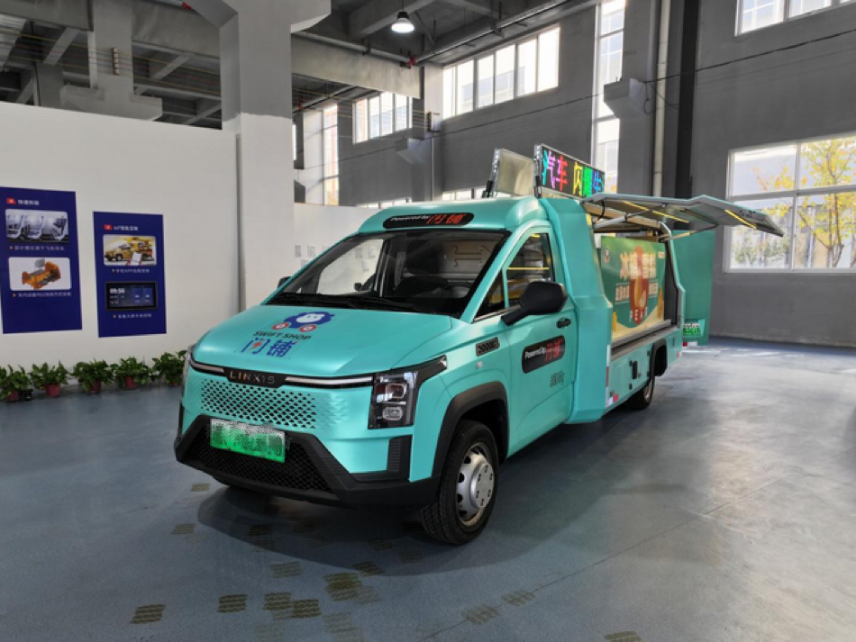 这里是安徽祺力专用车制造有限公司“闪铺”新能源汽车的线下测试现场。随着研发人员的指令,一台浅蓝色新能源汽车缓缓展开侧翼,液压装置平稳抬升车顶,短短2分钟内,便变身为15平方米的整洁商铺。