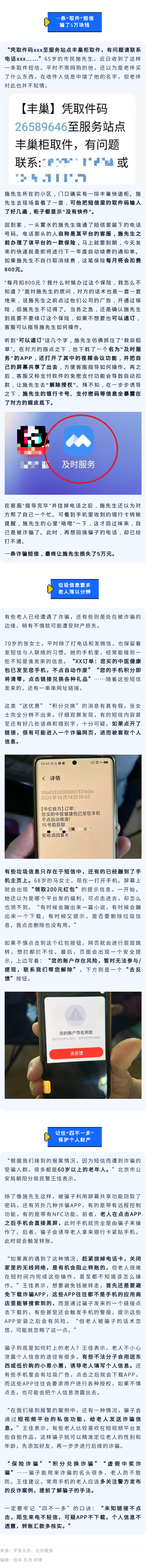 除了打电话、发微信,一些老人如今仍保持着通过短信来联络的习惯。但老人的手机短信里,也往往会存有不少垃圾信息,有些信息甚至暗藏诈骗套路。警方提醒,老年人已成为短信诈骗的主要受害群体,平时使用手机时,务必牢记“四不一多”口诀,守护好个人财产。