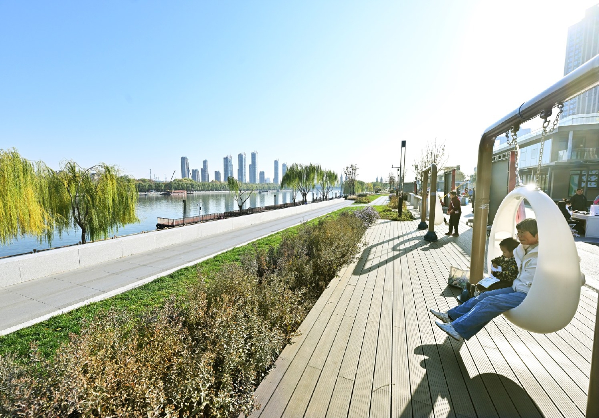 运河西岸的美,第一眼是开阔的。河面在这里变得宽阔,周边运河商务区的现代建筑天际线成为最好的背景板。但这种美不止于静态。清晨,河面雾气朦胧,晨跑者的身影划破宁静。午后,彩色座椅上,捧着书的阅读者一坐就是半天。黄昏是西岸的魔法时刻——夕阳把河水染成金色,楼宇的玻璃幕墙开始反射温暖的光芒,不少摄影爱好者在这里定格美好的“水岸生活”,大赞“妙哉”。沿河的绿道旁,宋庄艺术家设计的城市家具点缀其间。明亮跳跃的色彩搭配、人形靠背座椅、造型灵动的公共艺术装置……这些“多巴胺配色”的元素,让整个河岸显得轻快而活泼。