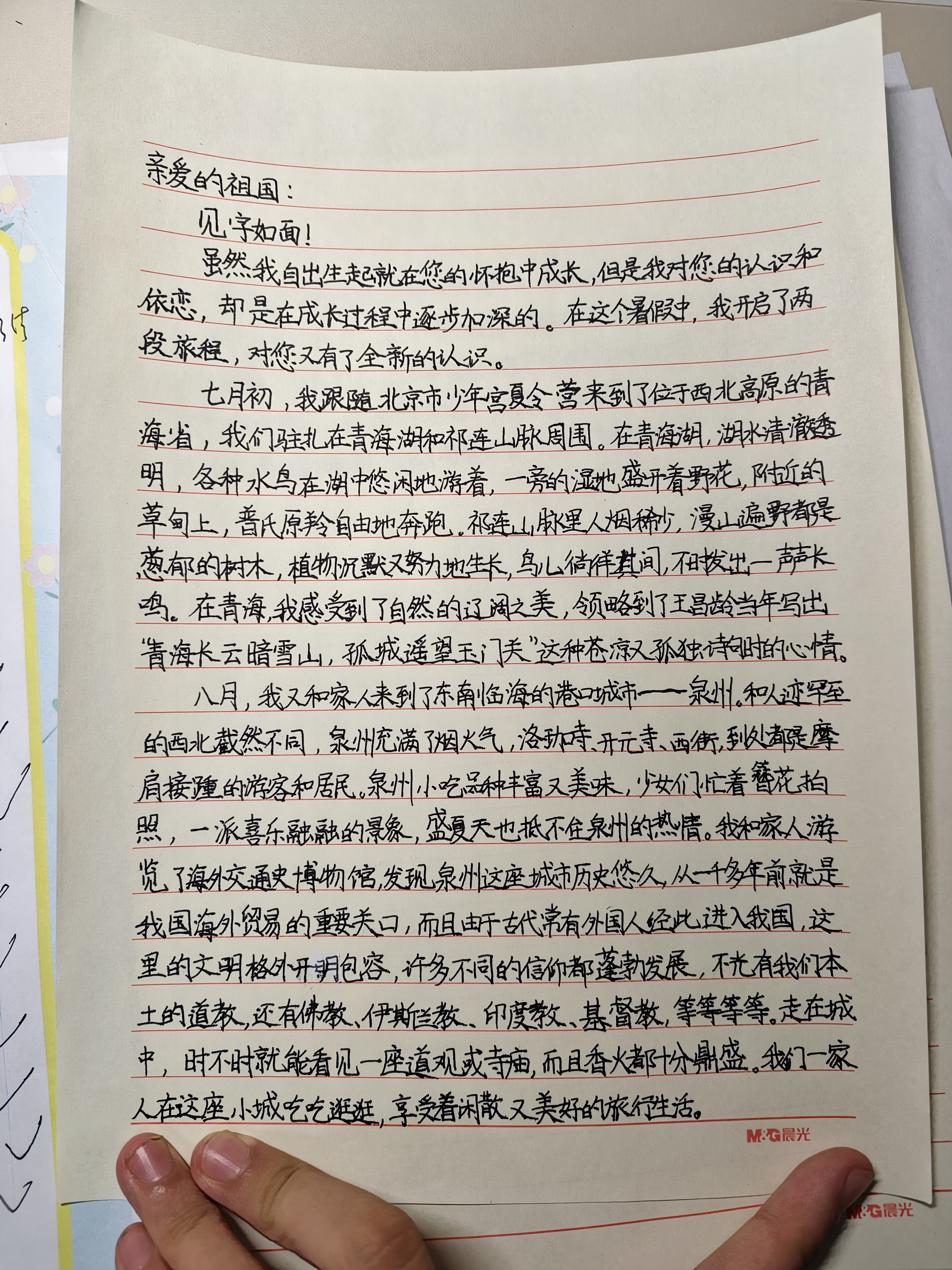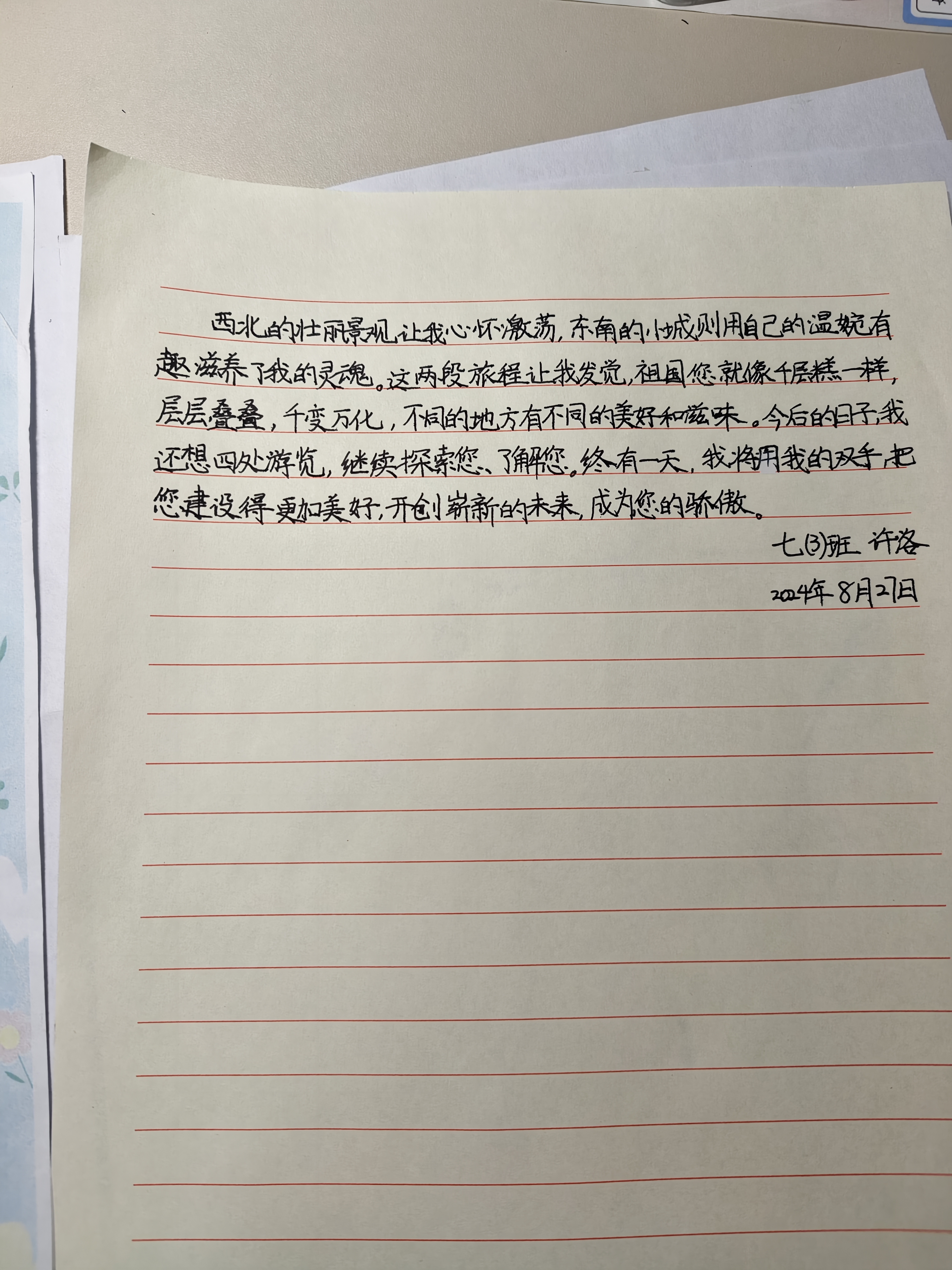 今天这幅AI绘画作品的原型来自北京市第二十五中学七年级(3)班乔许洛的书信作品《写给祖国的一封信》。