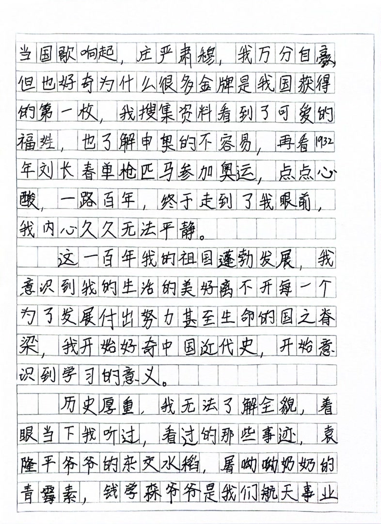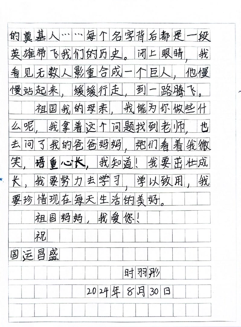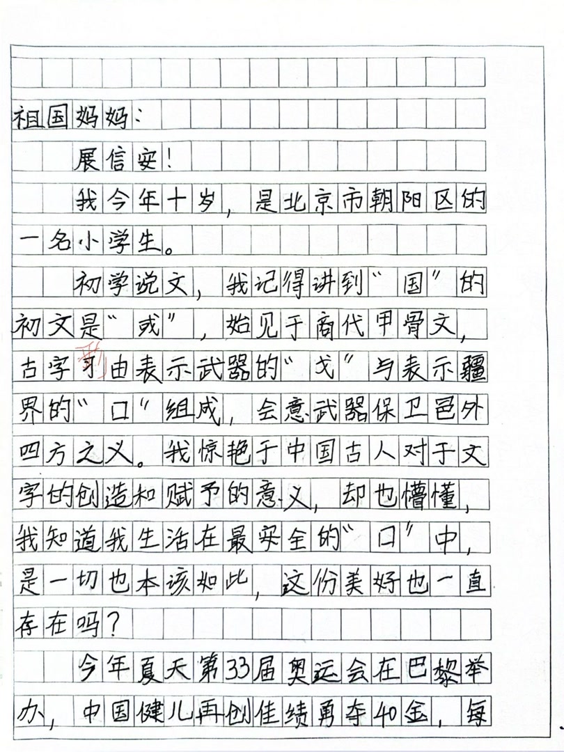 今天这幅AI绘画作品的原型来自朝阳区人朝分东坝学校五年级(7)班时羽彤的书信作品《祖国妈妈,您好》。