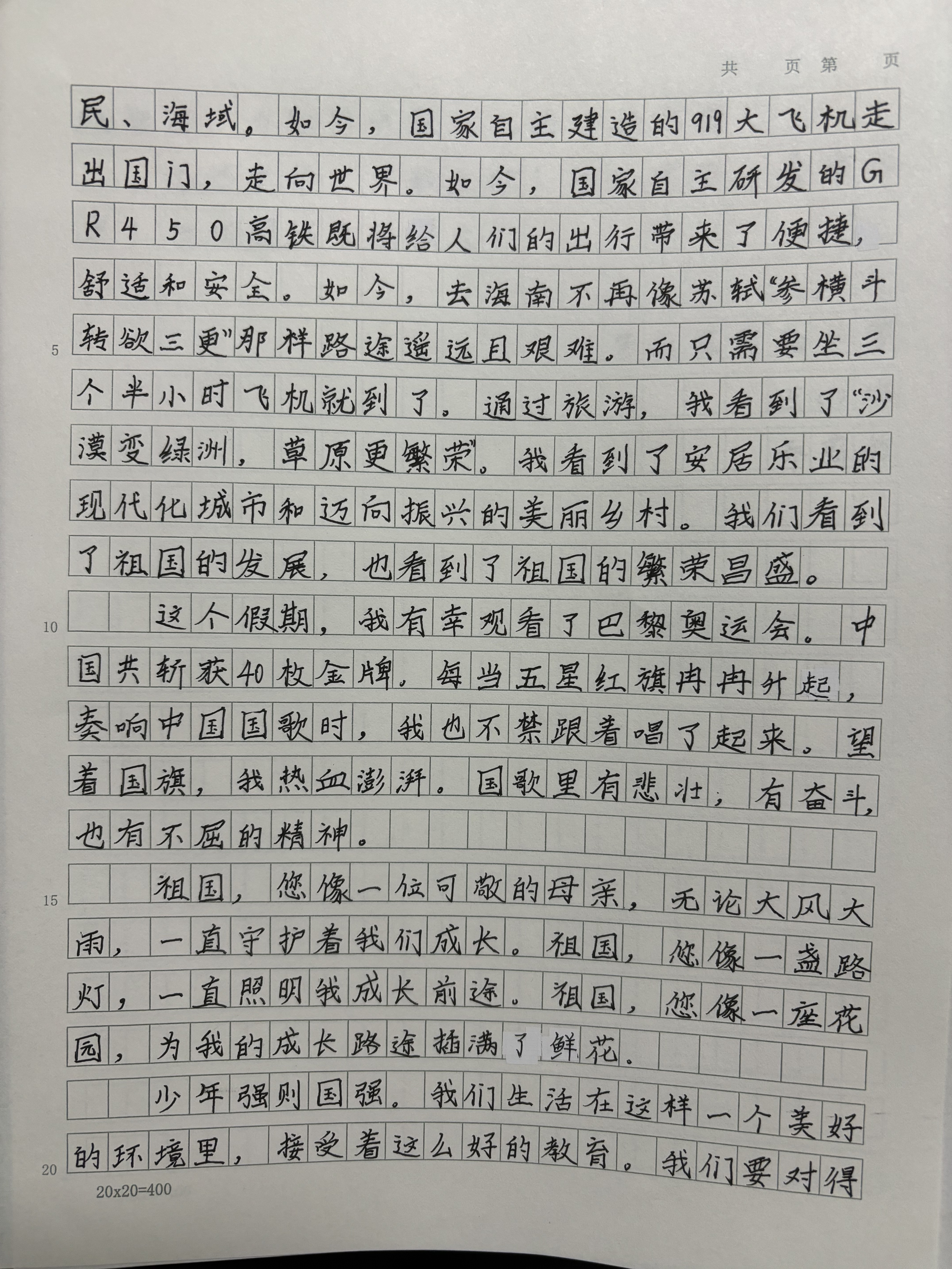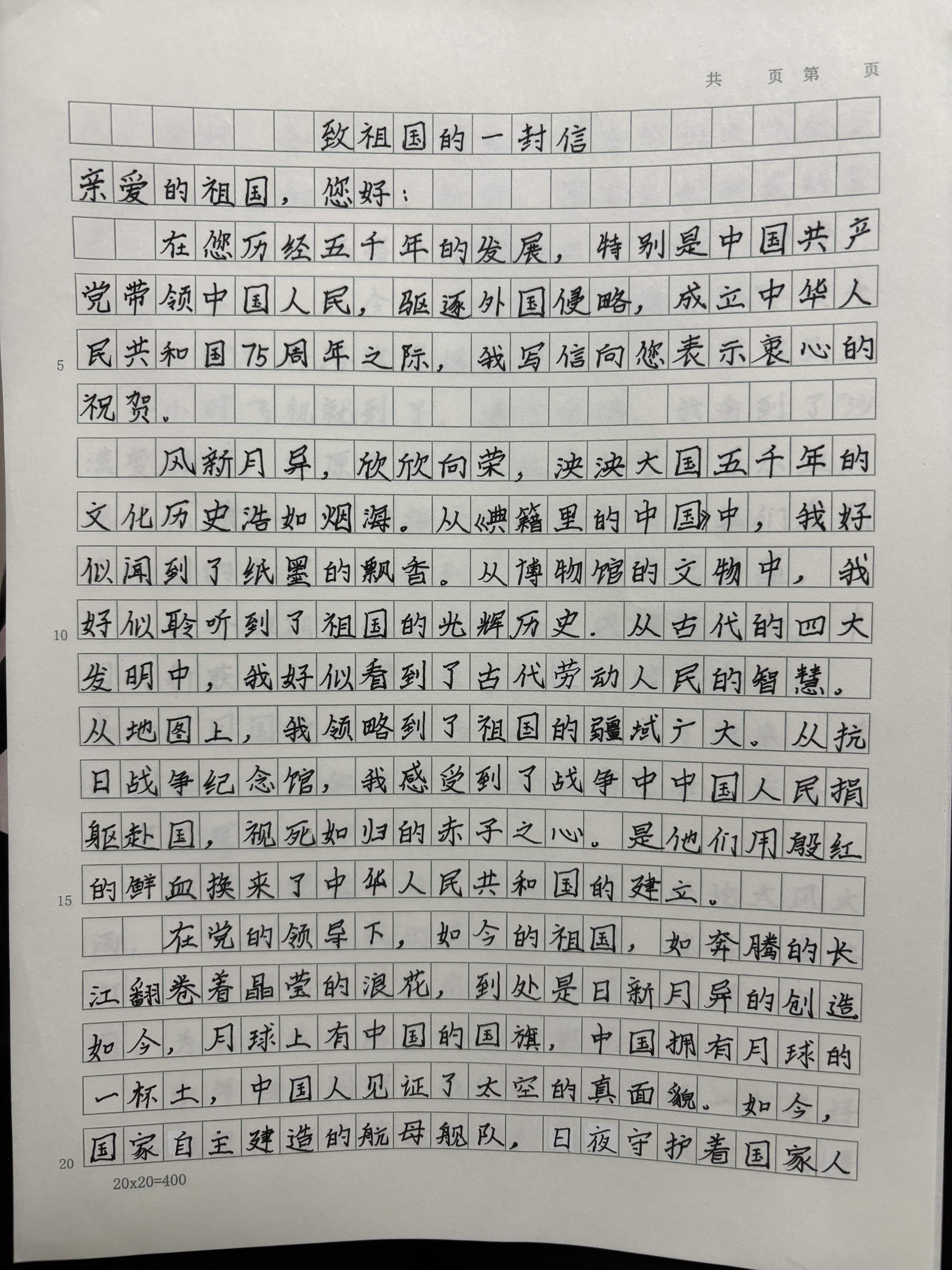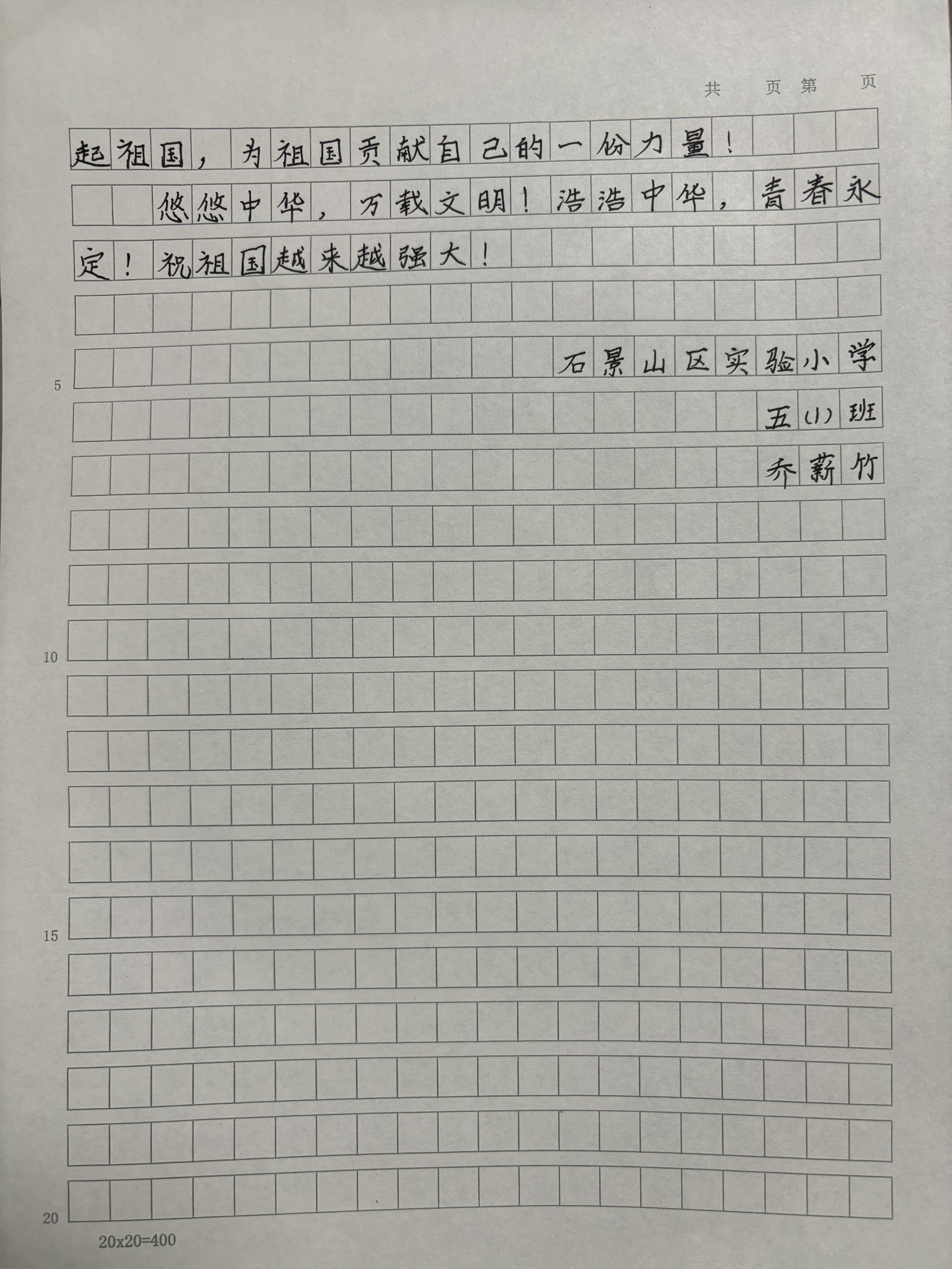 今天这幅AI绘画作品的原型来自石景山区实验小学五年级(1)班乔薪竹的书信作品《致祖国的一封信》。