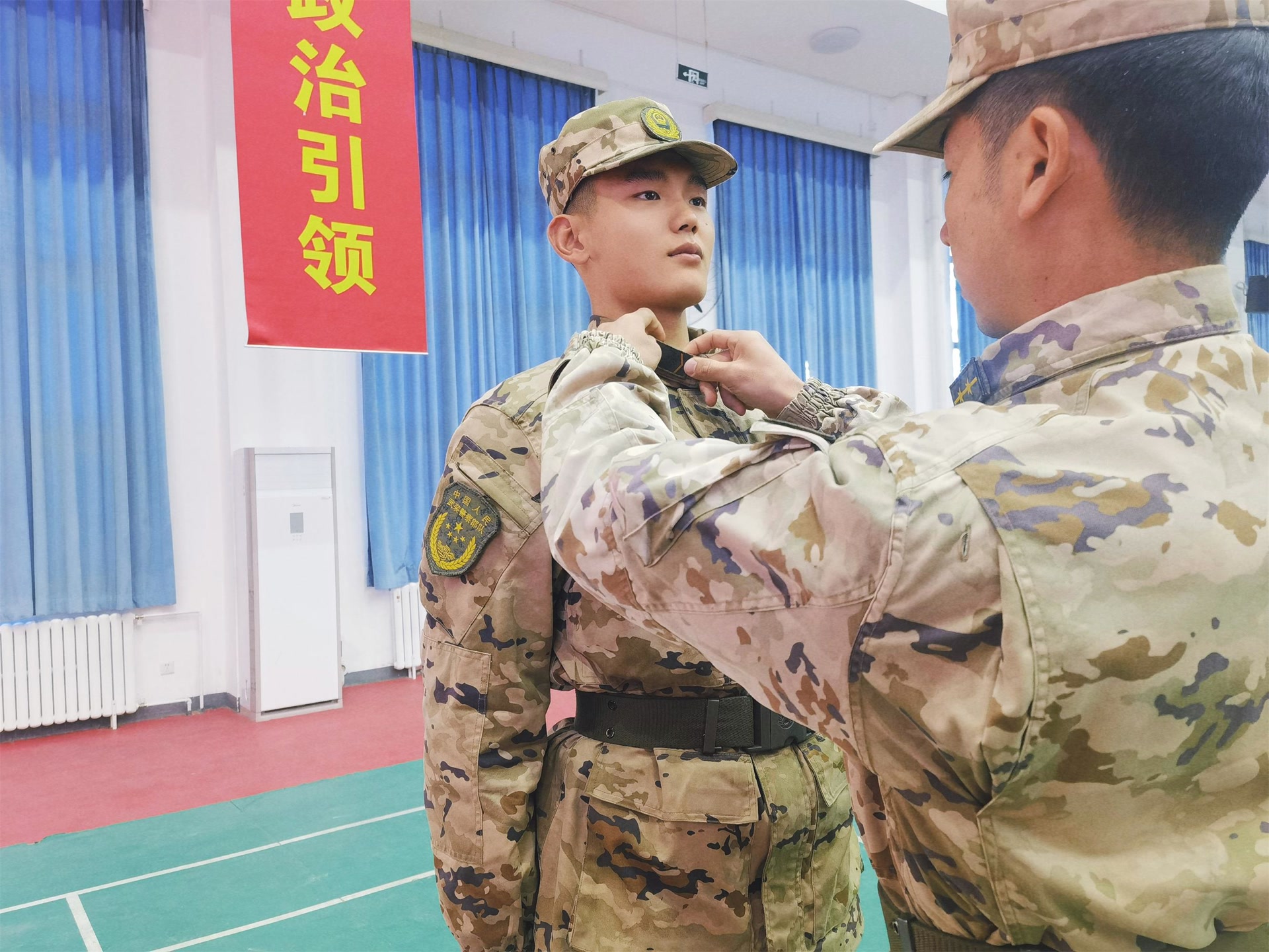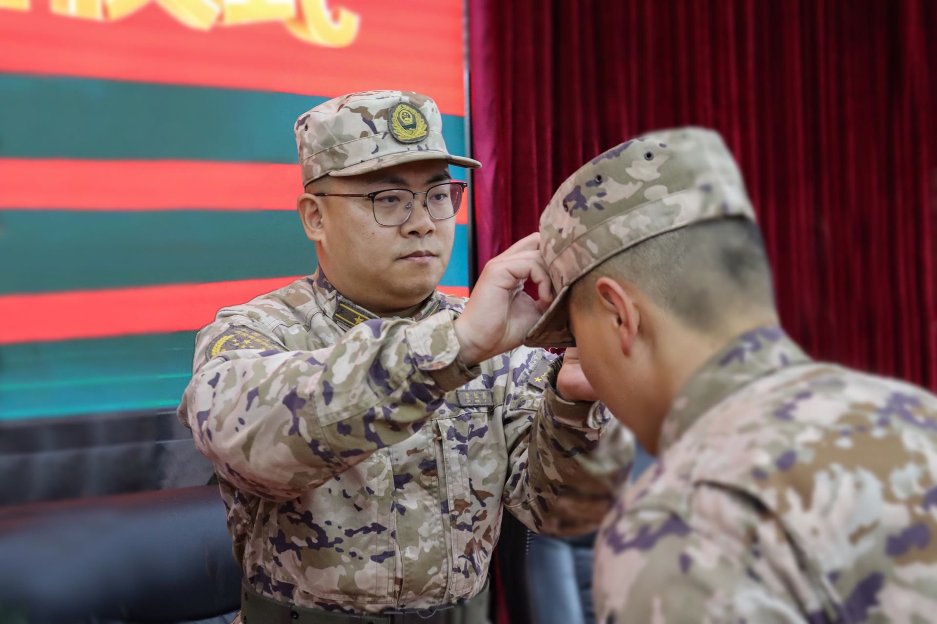 “授予以下同志列兵警衔……”授衔命令宣读完毕后,支队领导、新训骨干分别为新兵们佩戴警衔。一纸命令、一次授衔,这一刻他们不再是普通的地方青年,而是肩负保家卫国重任的革命军人。
