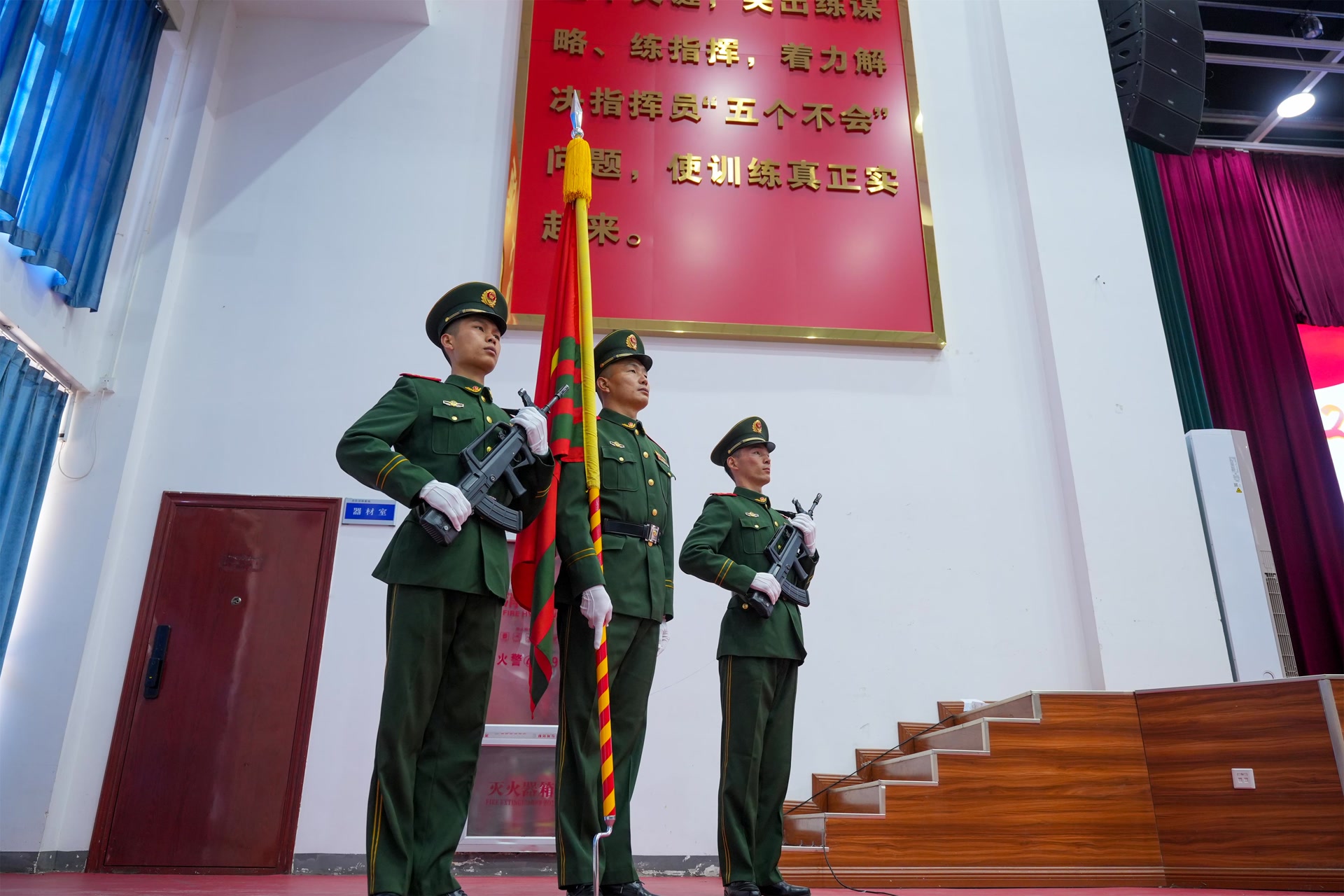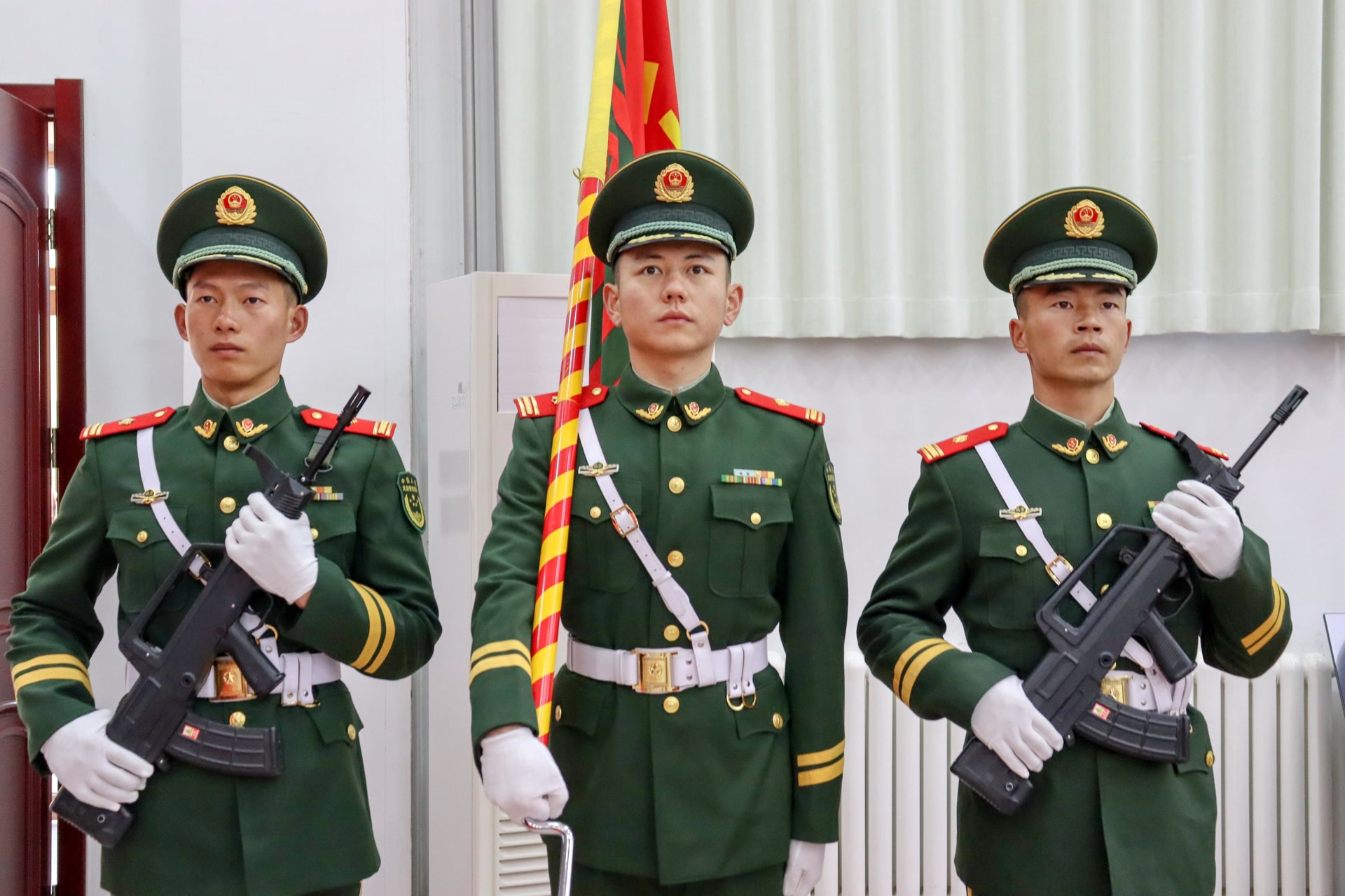授衔仪式在雄壮的国歌中拉开序幕,3名护旗手护送武警部队旗入场,新战友们整齐列队、昂然挺立,满怀期待地迎接军旅“成人礼”。