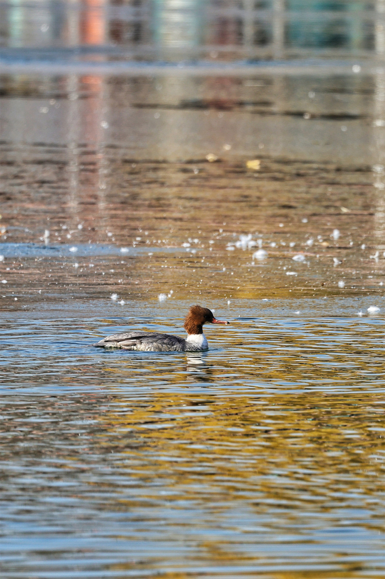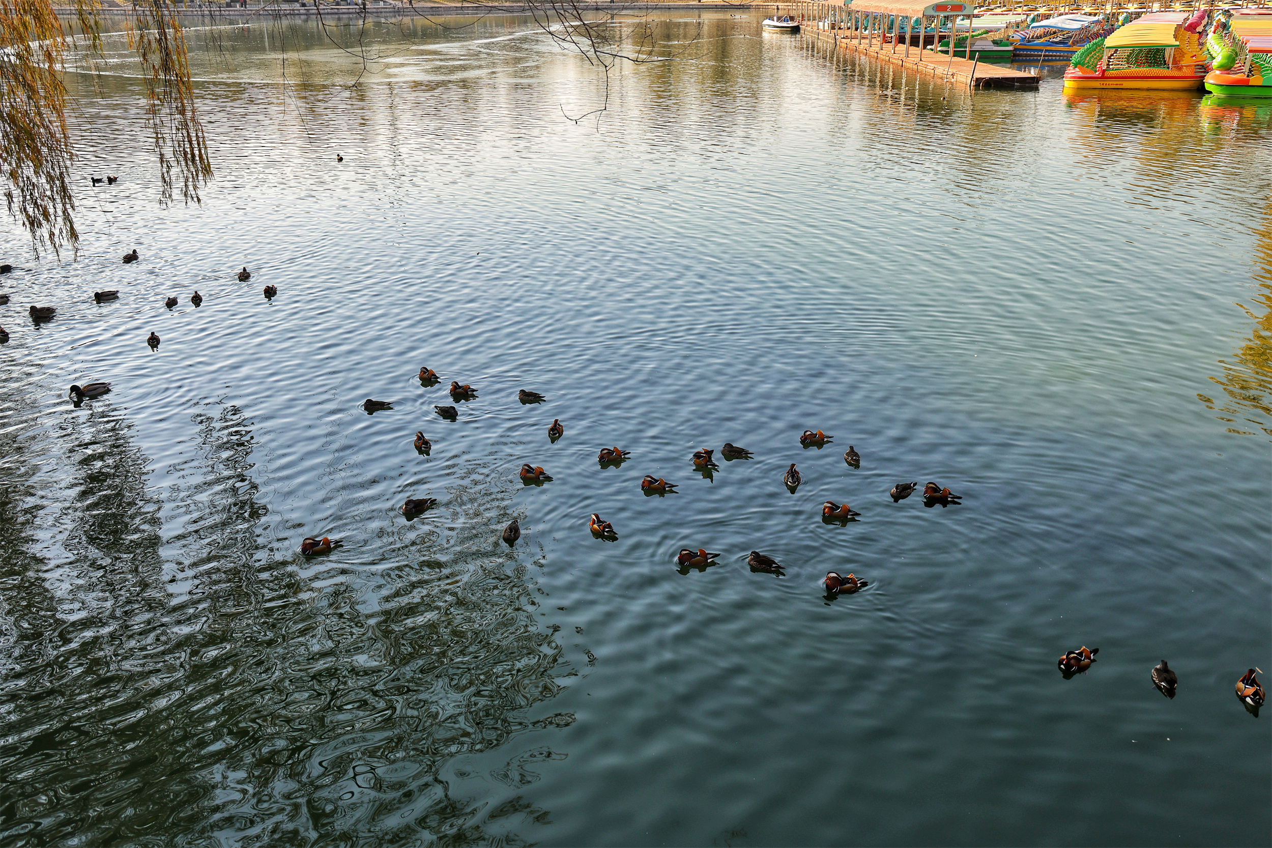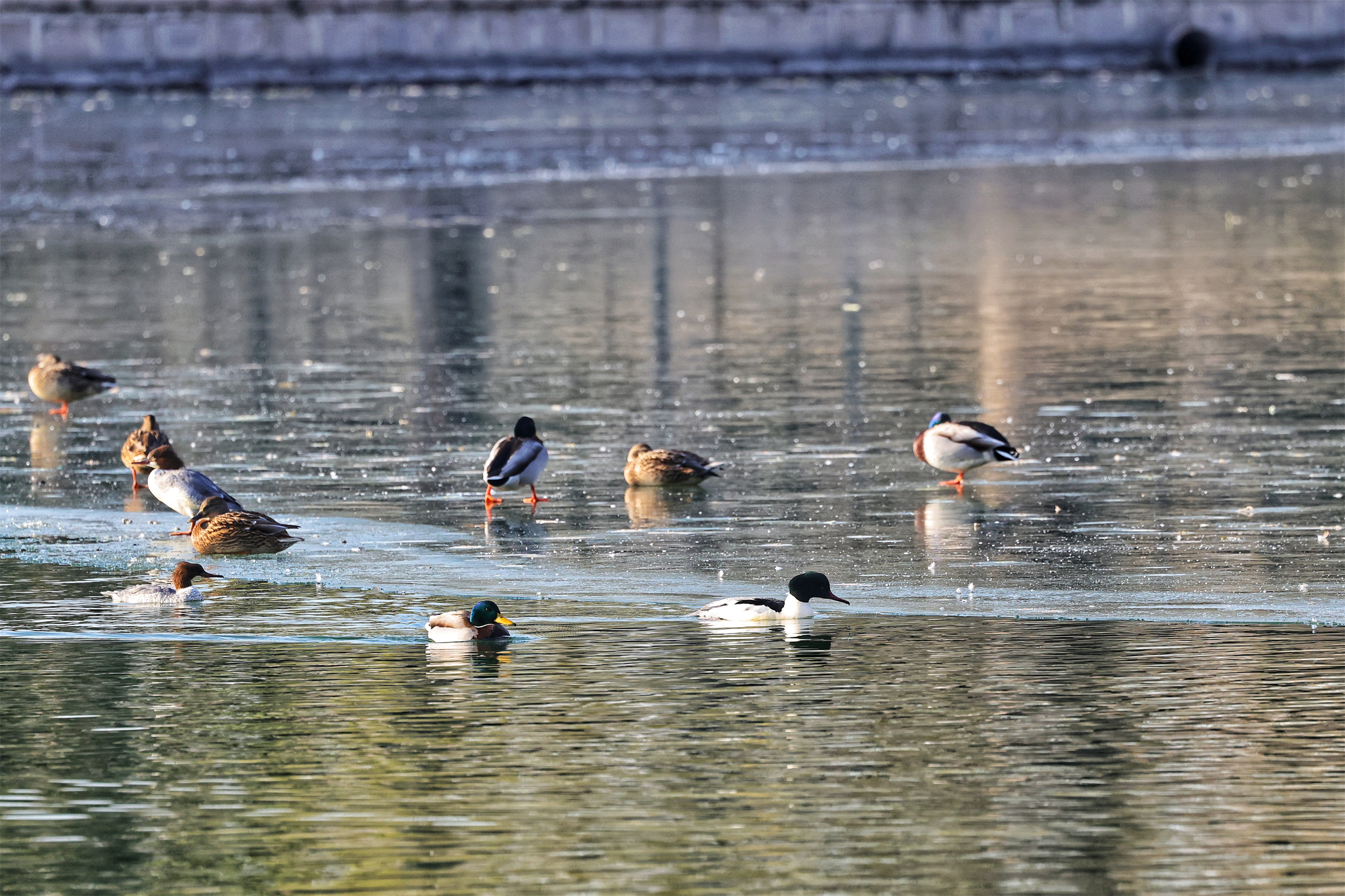 秋沙鸭身侧的鸳鸯、䴙鹈与绿头鸭是这里的常驻居民。它们三五成群,或在冰缝间戏水,或蜷在湖心岛休整,羽色与湖光相映,为清冷的初冬添了灵动生机。