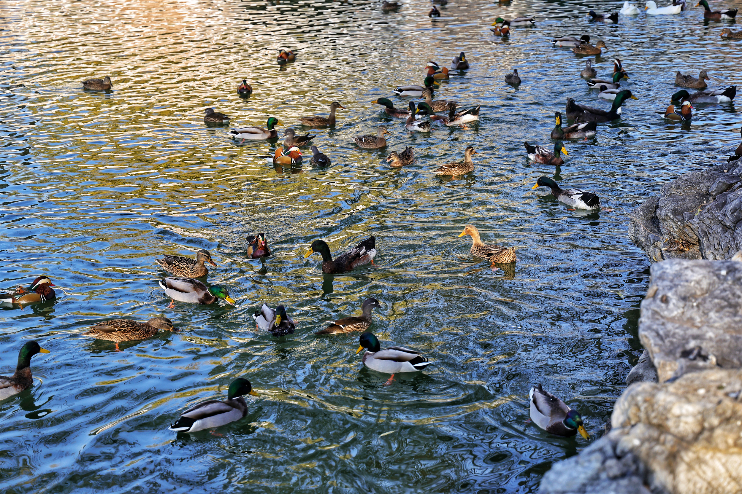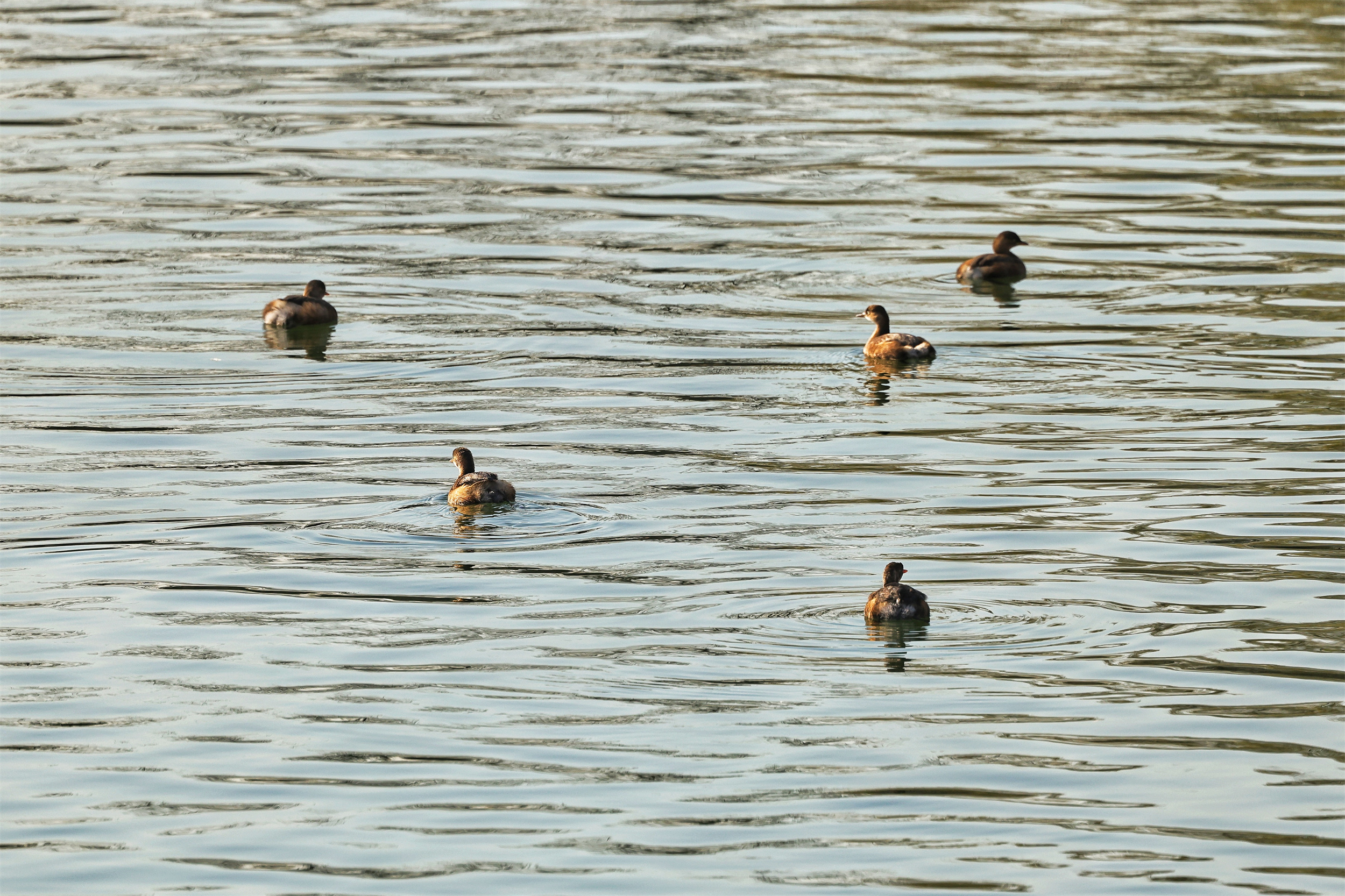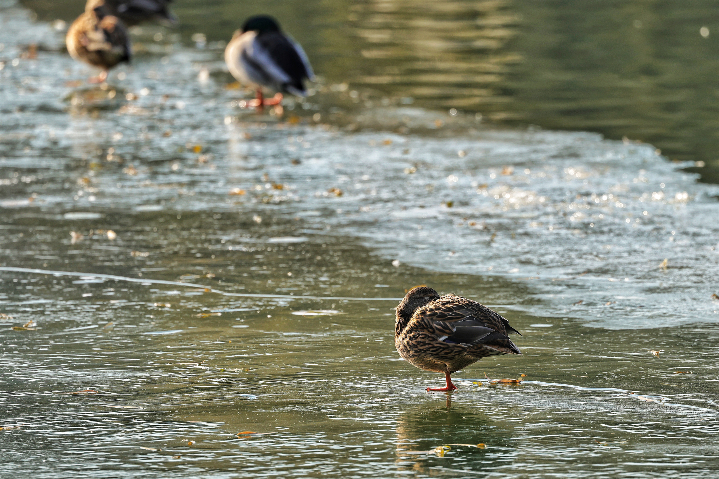 秋沙鸭身侧的鸳鸯、䴙鹈与绿头鸭是这里的常驻居民。它们三五成群,或在冰缝间戏水,或蜷在湖心岛休整,羽色与湖光相映,为清冷的初冬添了灵动生机。
