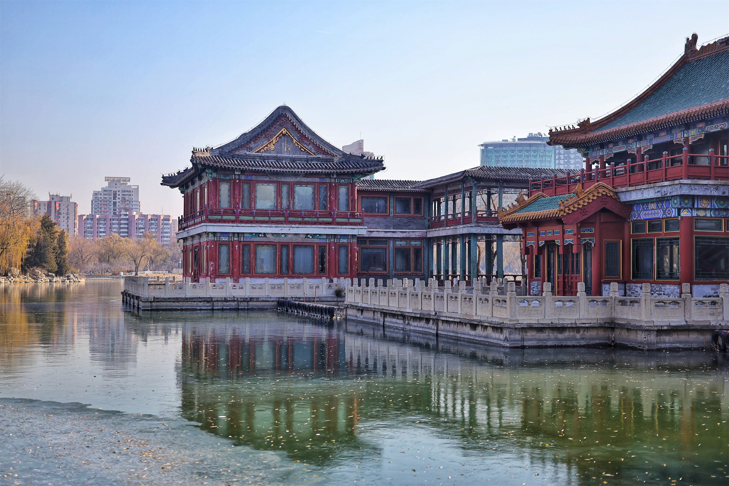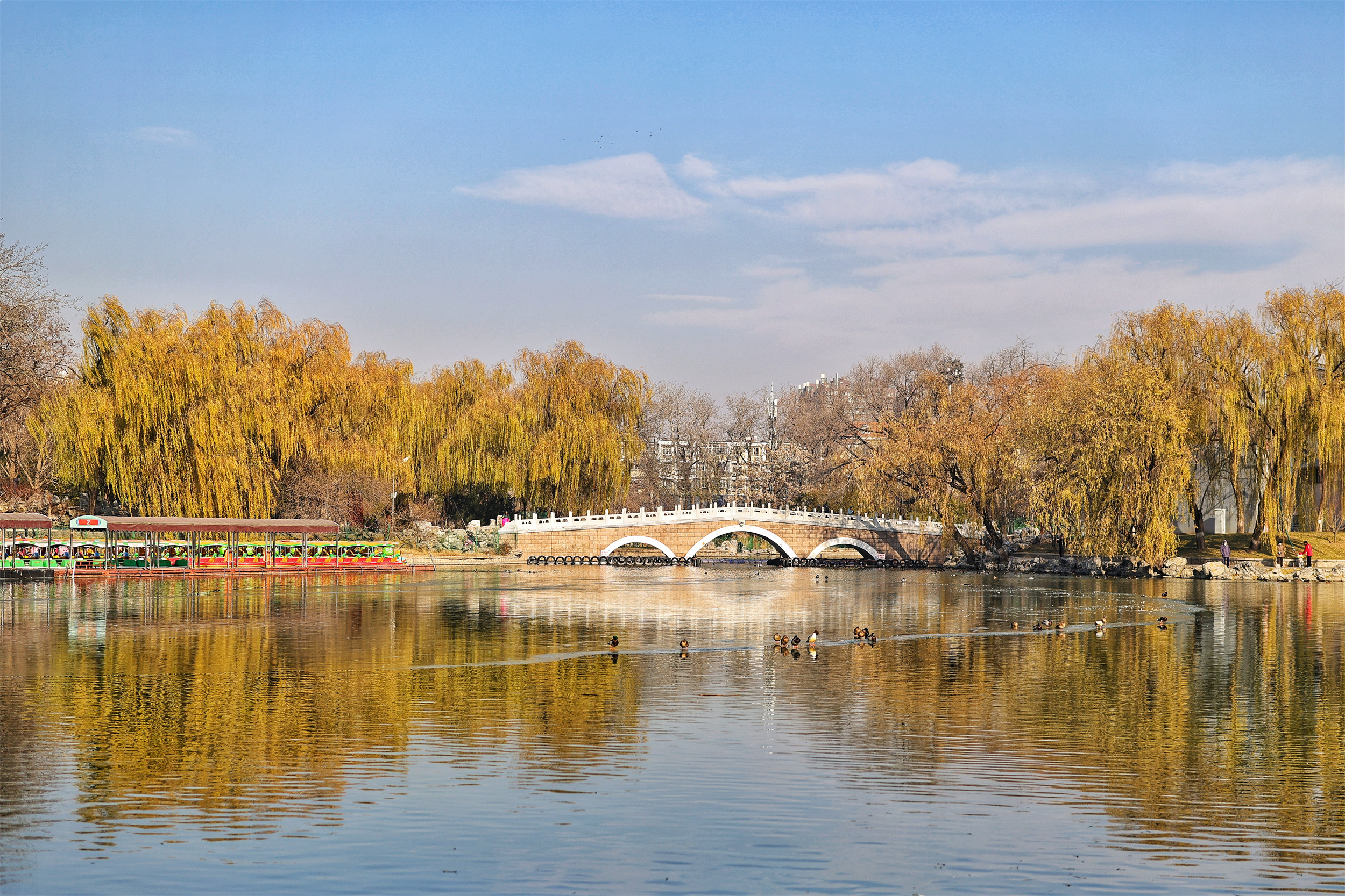 初冬的龙潭公园湖面率先换了模样,近岸处凝起薄冰,像镶了通透的银边。