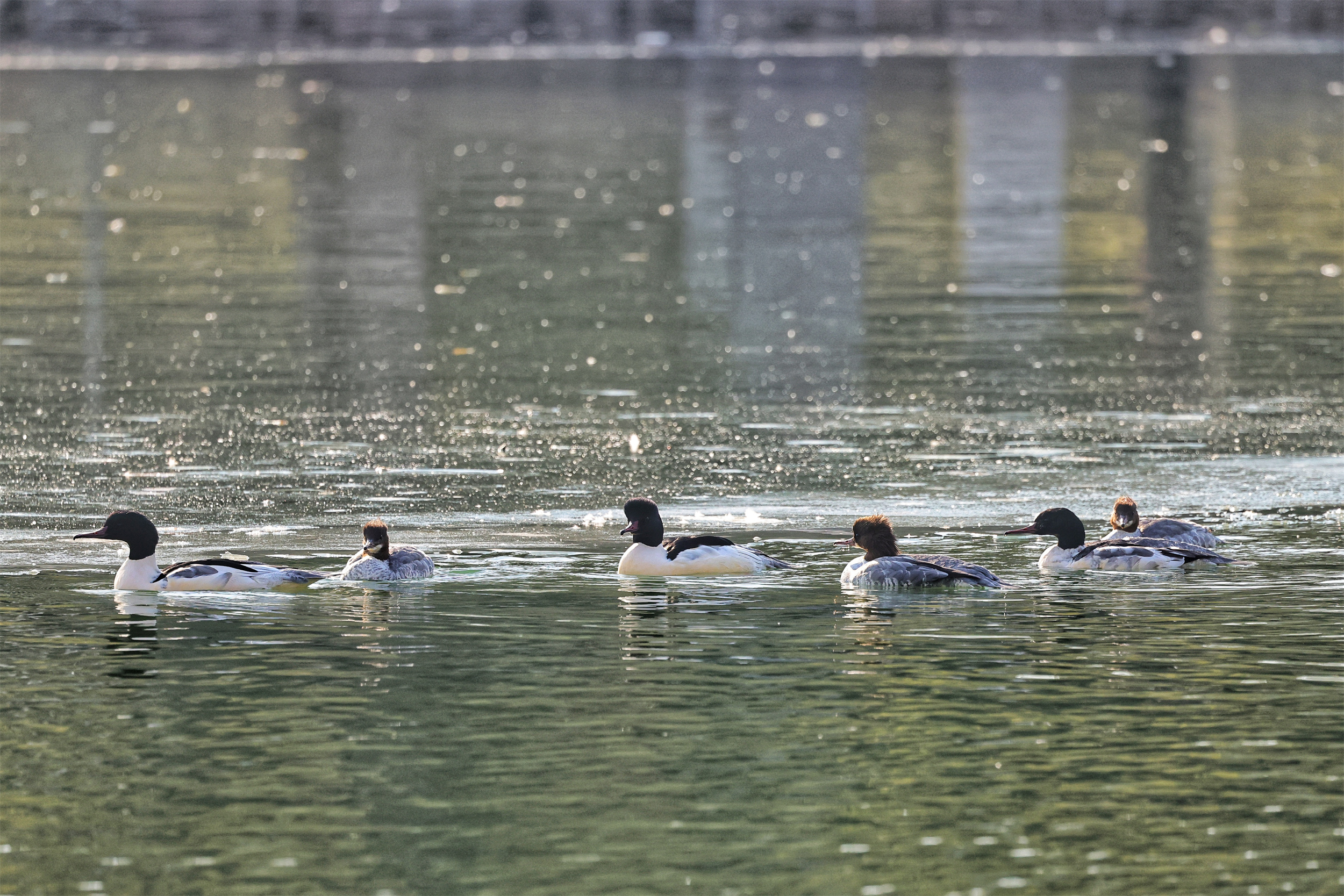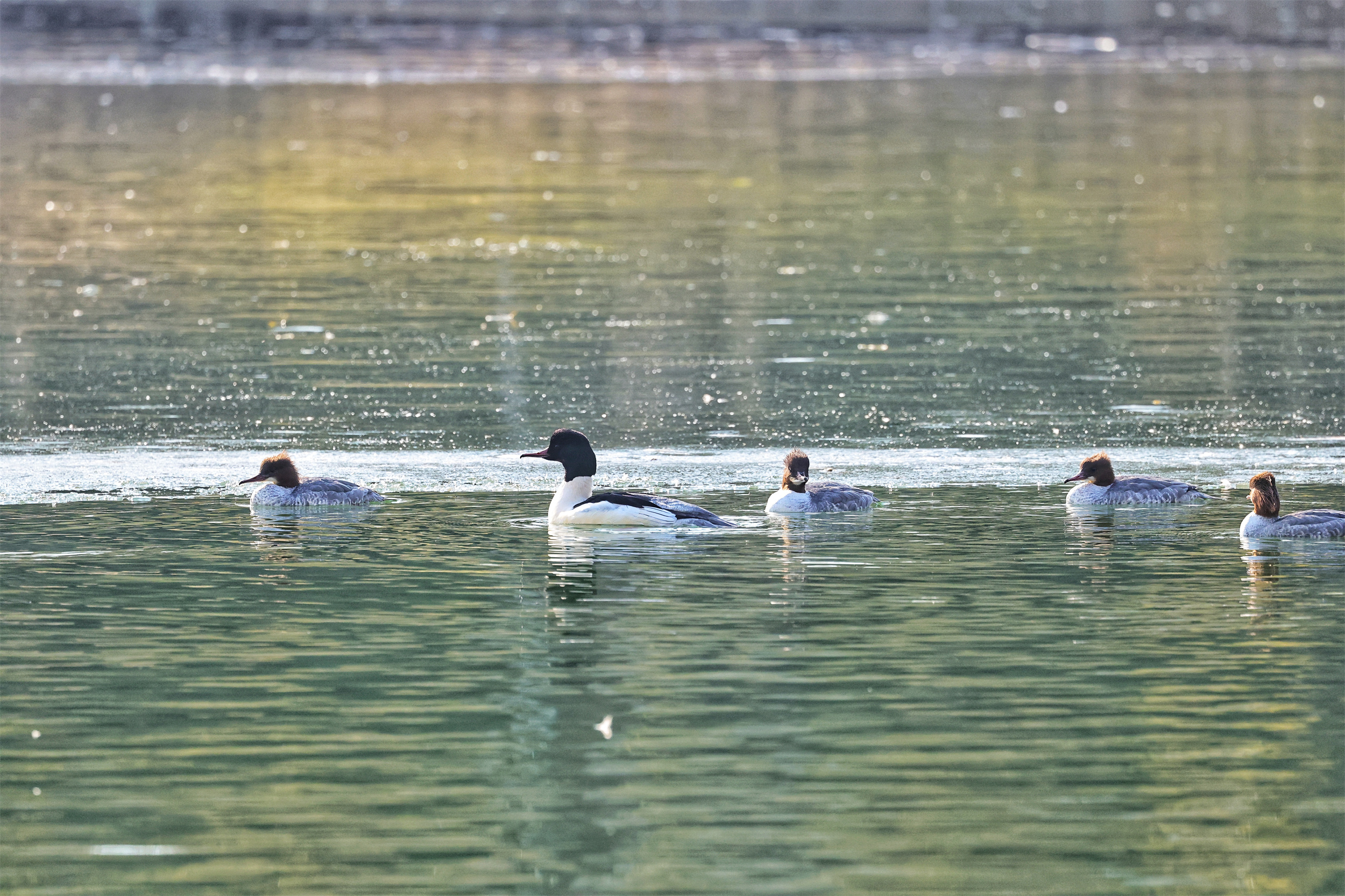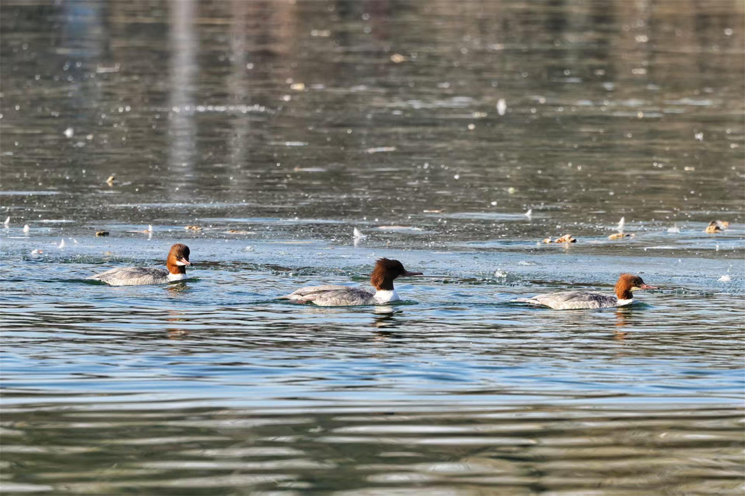 湖中央,十来只秋沙鸭正自在游弋。这越冬的贵客披着黑白相间的羽衣,时而扎入水中觅食,时而骤然展翅,翅尖掠过水面激起细碎涟漪,引得岸边游人轻按快门。