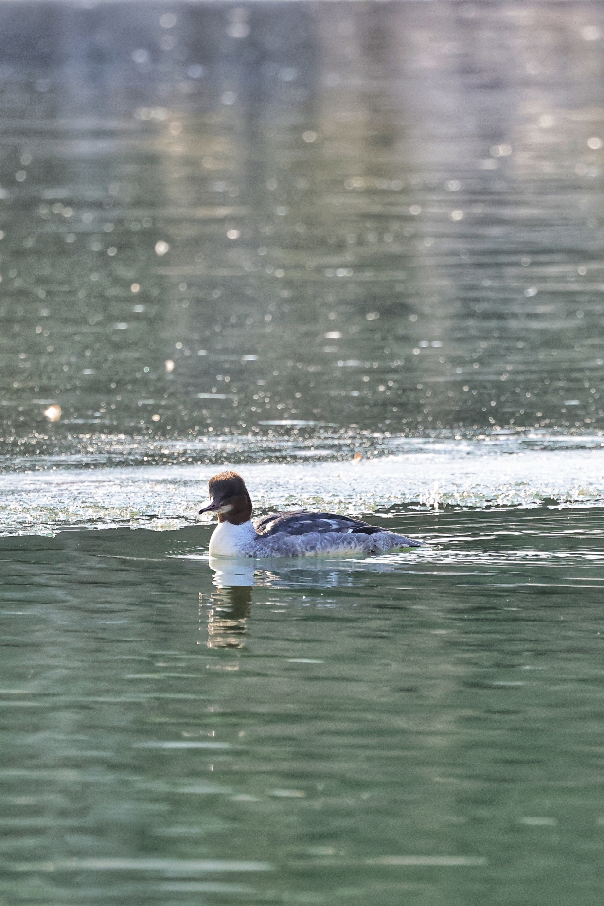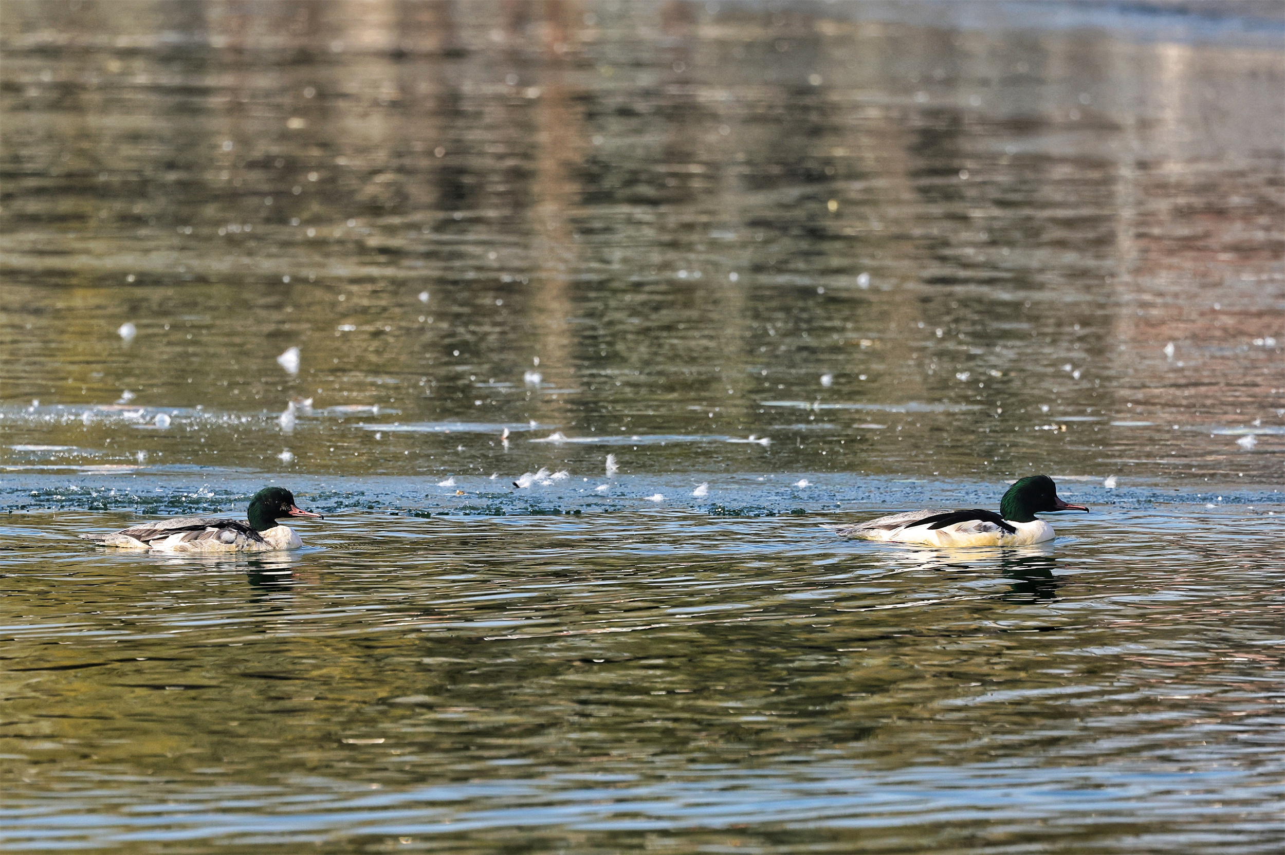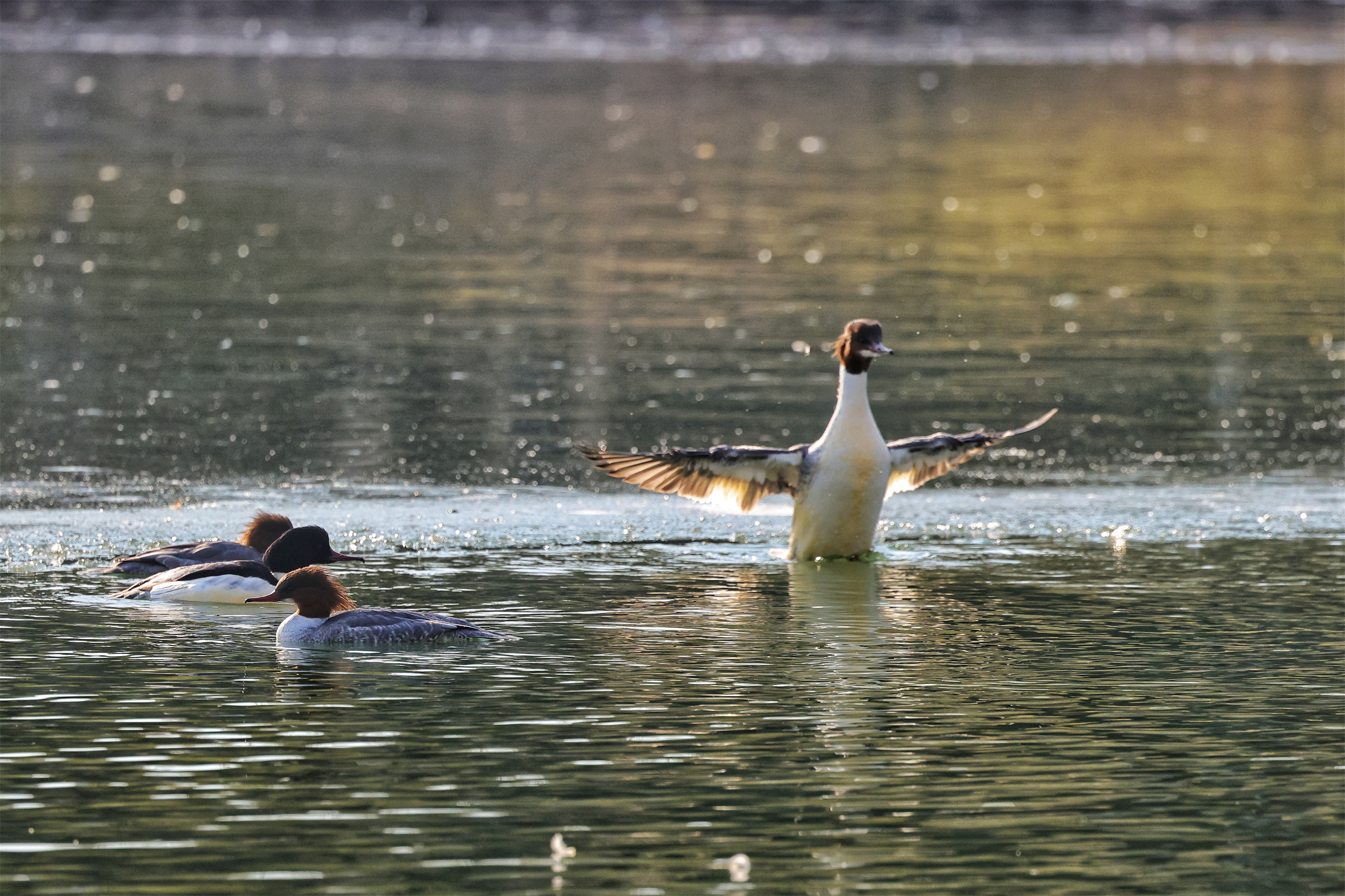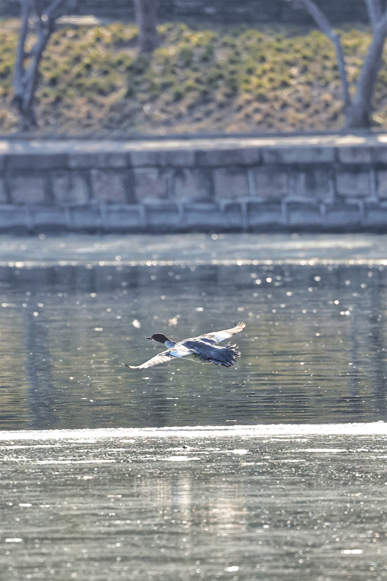 湖中央,十来只秋沙鸭正自在游弋。这越冬的贵客披着黑白相间的羽衣,时而扎入水中觅食,时而骤然展翅,翅尖掠过水面激起细碎涟漪,引得岸边游人轻按快门。