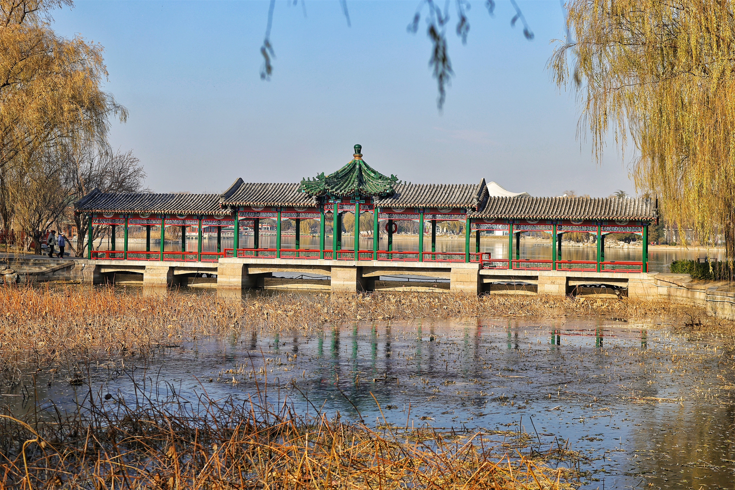 岸边的景致仍带着秋的余韵。垂柳未全黄,松柏更苍翠。残荷不再擎雨盖,却以枯枝勾勒出简练的线条美,在粼粼波光中倒映成水墨意境。