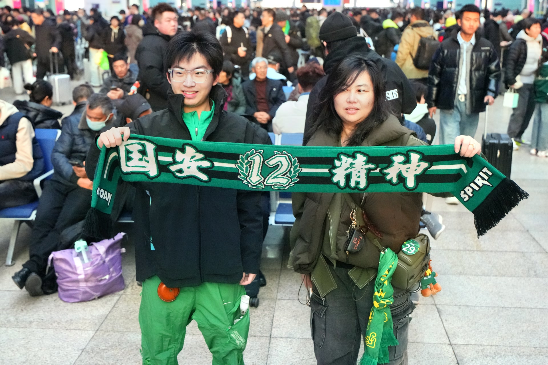 柔和的晨曦下,忙碌的北京南站和平时有些不大一样。在G115次列车的检票口前,数百名身着绿色球迷服、戴着助威围巾的国安球迷,组成了一片“绿色的海洋”。
