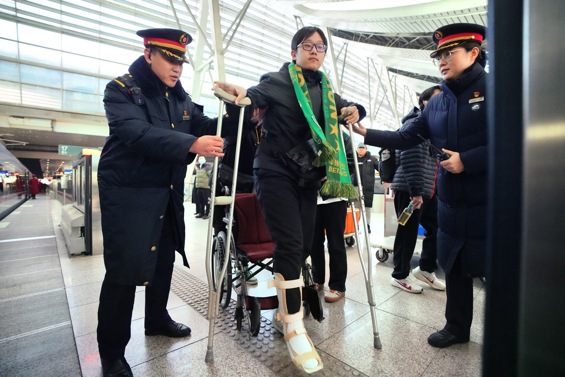 候车的人群中,轮椅上的17岁球迷张宸铭成为大家关注的焦点。“这是真球迷。”同行的伙伴纷纷朝他伸出大拇指。面对大家的关心,张宸铭有些不好意思。他说,自己很早就决定到苏州看球,不巧的是一周前意外骨折了。但为了能够亲眼见证国安队在决赛中的表现,他还是坚持坐着轮椅前往。“这么多年才有一次机会,一定要珍惜。”张宸铭的父亲说,他前一天通过12306预约了重点旅客服务,这次出行非常顺畅。