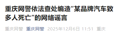 据重庆网警消息,近日,在“汽车行业网络乱象专项整治行动”中,重庆公安机关网安部门接报,有人恶意拼接图片,编造不实信息,损害车企商业信誉。经查,网民梅某为博取眼球、吸引流量,在社交网络平台编造不实图文,宣称“某品牌汽车造成8杀,创单车最高击杀记录”,并恶意拼接2025年5月21日外省某地交通事故图片,引发网络舆论聚焦。