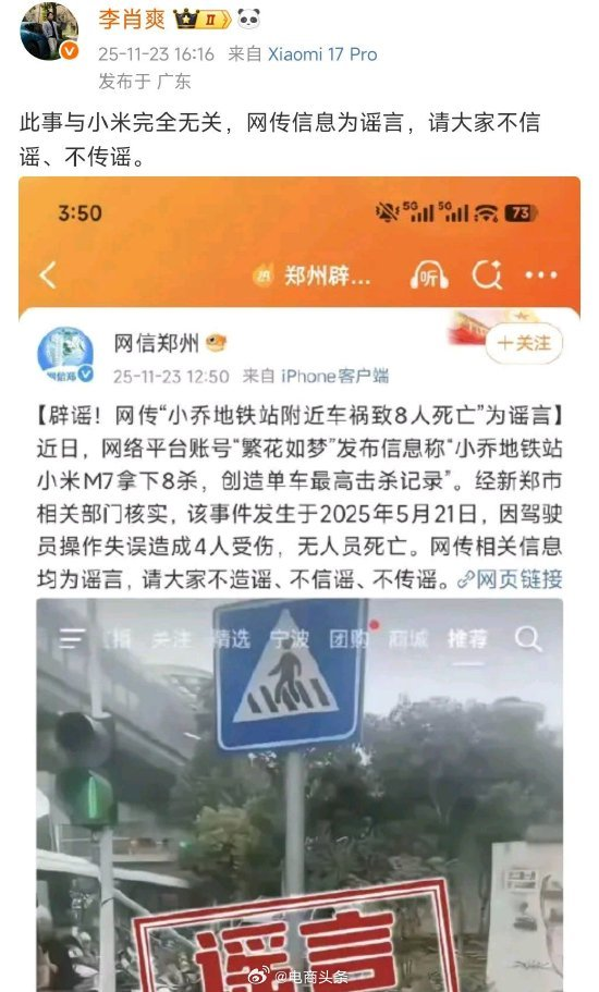 对于此前流传的谣言,小米汽车副总裁@李肖爽 于11月23日发文称:网传信息为谣言,请大家不信谣、不传谣。