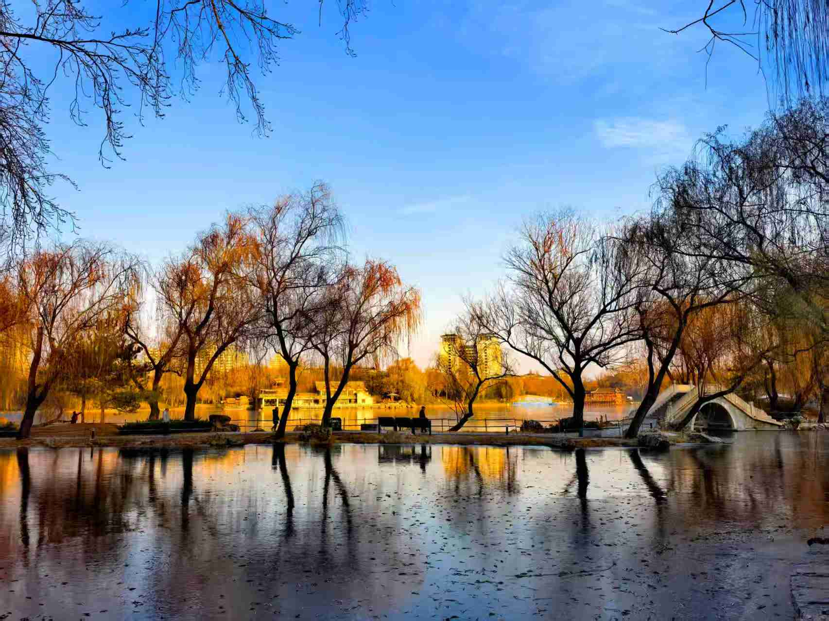 今天清晨,寒风凛冽,北京玉渊潭公园旭日东升美丽如画。