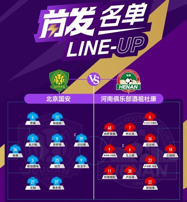 12月6日19时,北京国安队将与河南队进行2025中国足协杯决赛。赛前, 两队首发确定,国安延续了近来常用的442阵型,4名外援首发登场,用最强阵容向队史第五座足协杯冠军发起冲击。