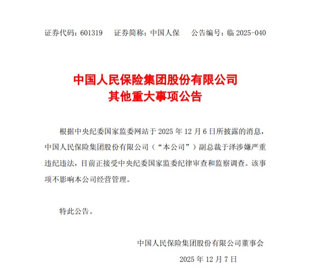 根据中央纪委国家监委网站于2025年12月6日所披露的消息,中国人民保险集团股份有限公司(“本公司”)副总裁于泽涉嫌严重违纪违法,目前正接受中央纪委国家监委纪律审查和监察调查。该事项不影响本公司经营管理。