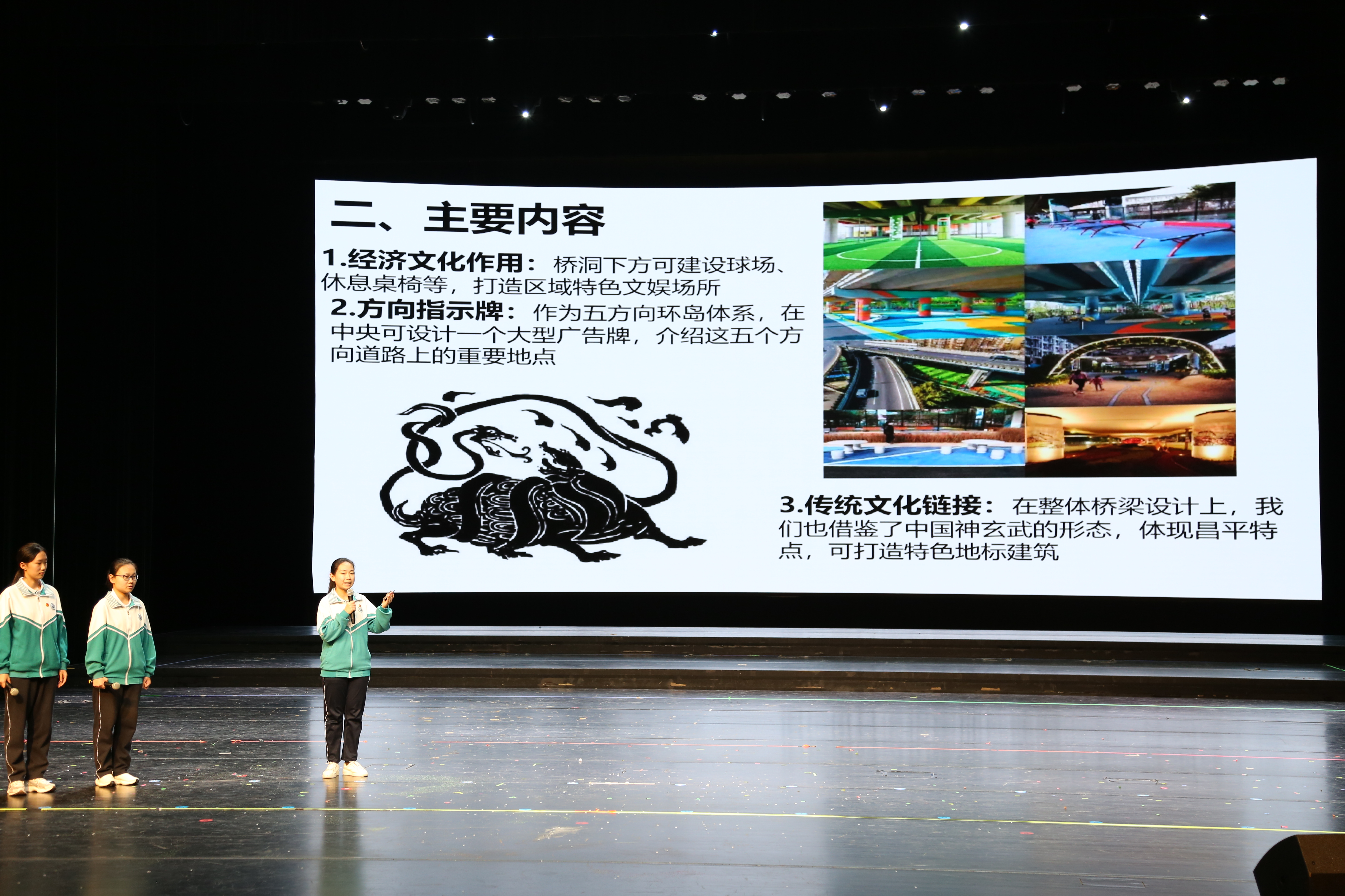 “西关环岛离我们学校不远,每天上下学都能感受到它承载着巨大的交通压力”“这个环岛连接着G6辅路、京青路、西关路等多条交通要道,早晚高峰及节假日期间拥堵不堪,我们上下学的时候也看到过一些交通事故发生”……展示活动中,昌平区第一中学的3名高三女生自信登台,生动地分享了她们每天都要面临的上下学“难”。