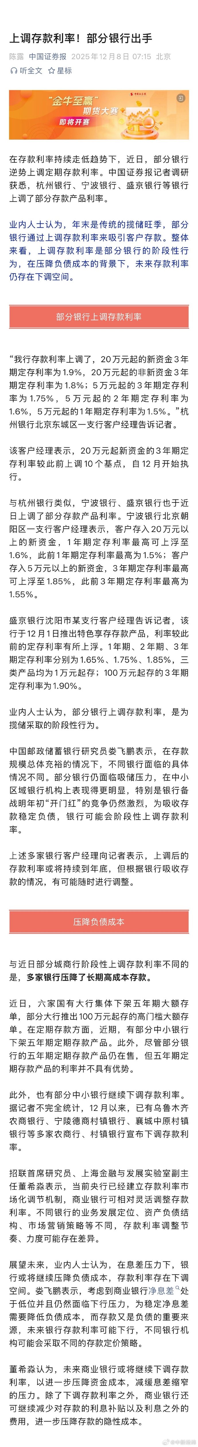 在存款利率持续走低趋势下,近日,部分银行逆势上调定期存款利率。中国证券报记者调研获悉,杭州银行、宁波银行、盛京银行等银行上调了部分存款产品利率。业内人士认为,年末是传统的揽储旺季,部分银行通过上调存款利率来吸引客户存款。整体来看,上调存款利率是部分银行的阶段性行为,在压降负债成本的背景下,未来存款利率仍存在下调空间。