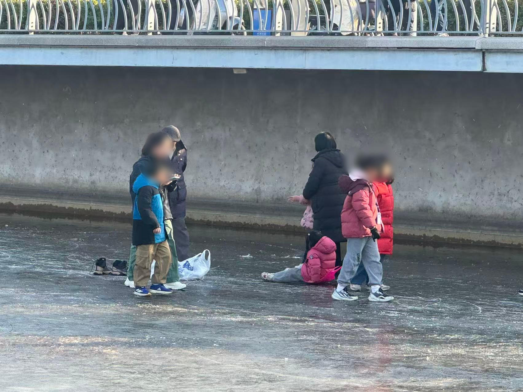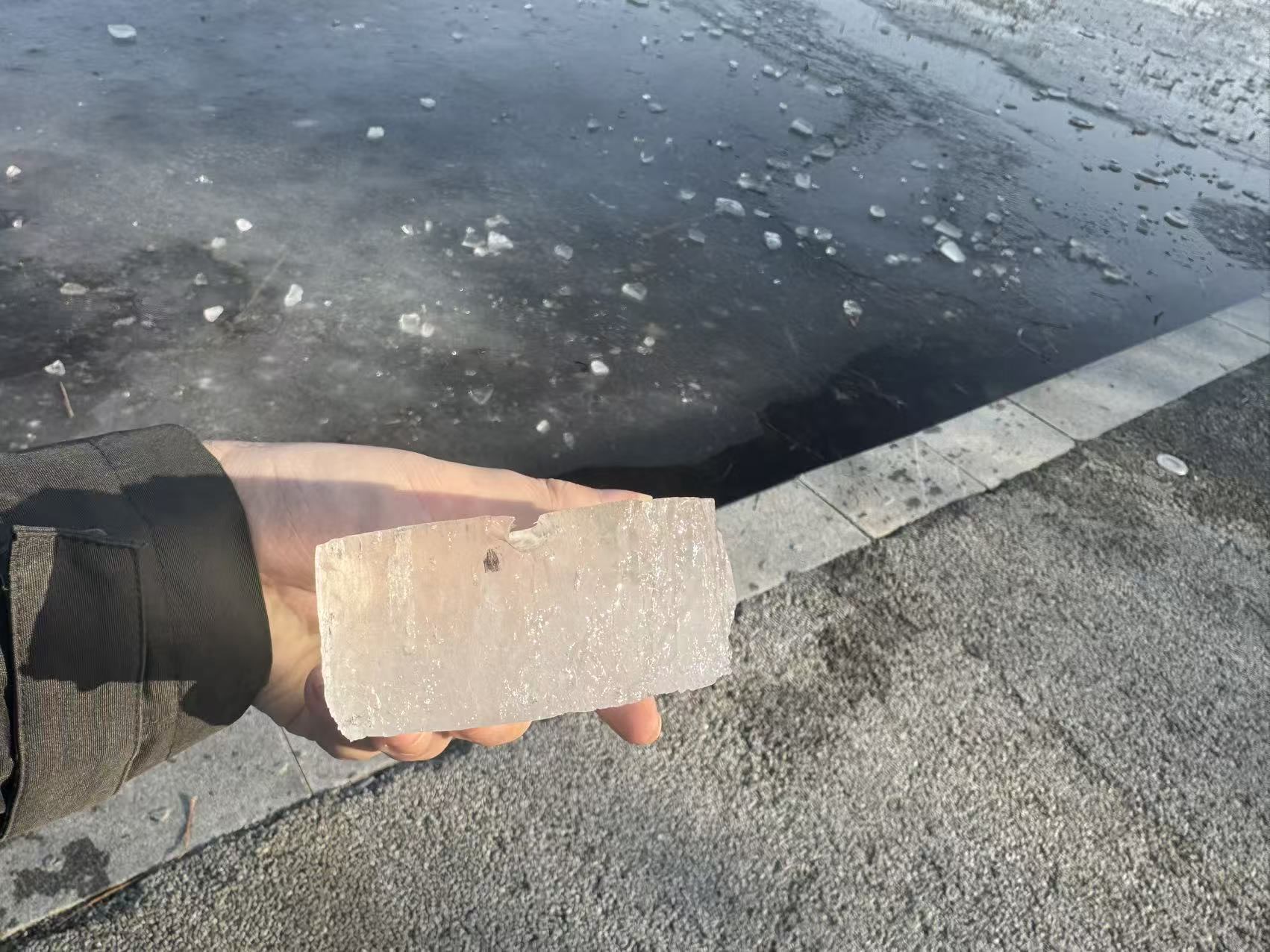 在距离这片“野冰场”二三十米处的岸边,不时有孩子敲碎冰面取出冰块来玩。记者观察发现,破碎处冰层仅三四厘米厚,冰下仍是流水,边缘泛着水光。一脚踩下去,咔嚓一声脆响,碎冰碴子四溅,看得人心里一哆嗦,大屯路南侧的冰面甚至已出现了明显裂纹。