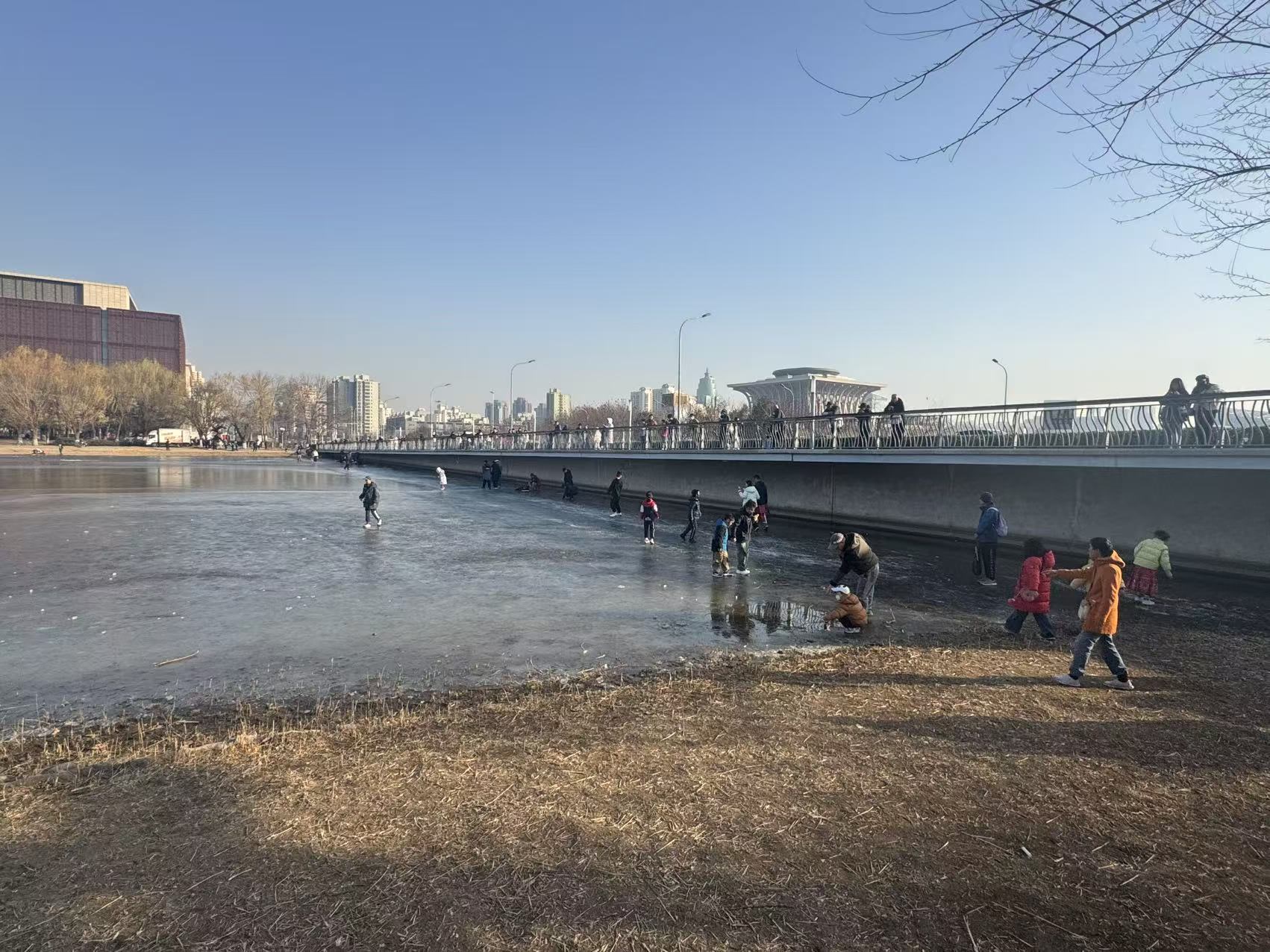 “大家都知道还没冻瓷实,所以就都在靠近岸边和大屯路的冰面上走走,不往远处去,应该没事儿。”一名市民告诉记者,虽然知道冰未冻实,但看到不少人在玩,便也心存侥幸上冰尝试下。“两三天前就看到有人在冰面上玩,他们胆可真大。”刘女士说,几乎年年都有掉进去的,她可不敢轻易冒险。