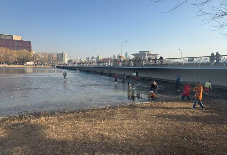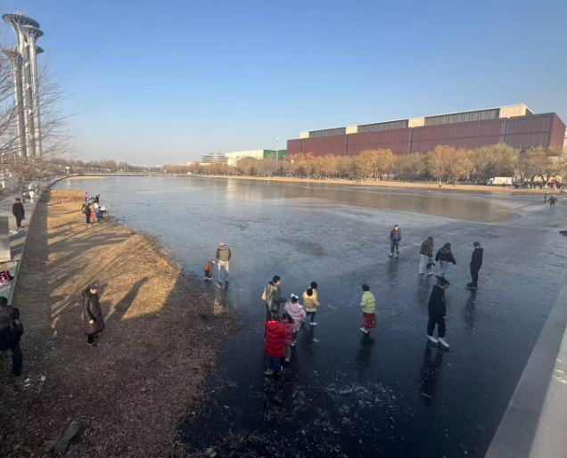 这两天,奥林匹克公园龙形水系湖面刚刚上冻,不少市民便按捺不住,不顾危险在此滑起了“野冰”。记者现场看到,湖面冰层只有三四厘米厚,部分区域的冰面已经出现明显裂纹。工作人员表示,龙形水系禁止滑野冰,正规冰场预计本月底才会开放。