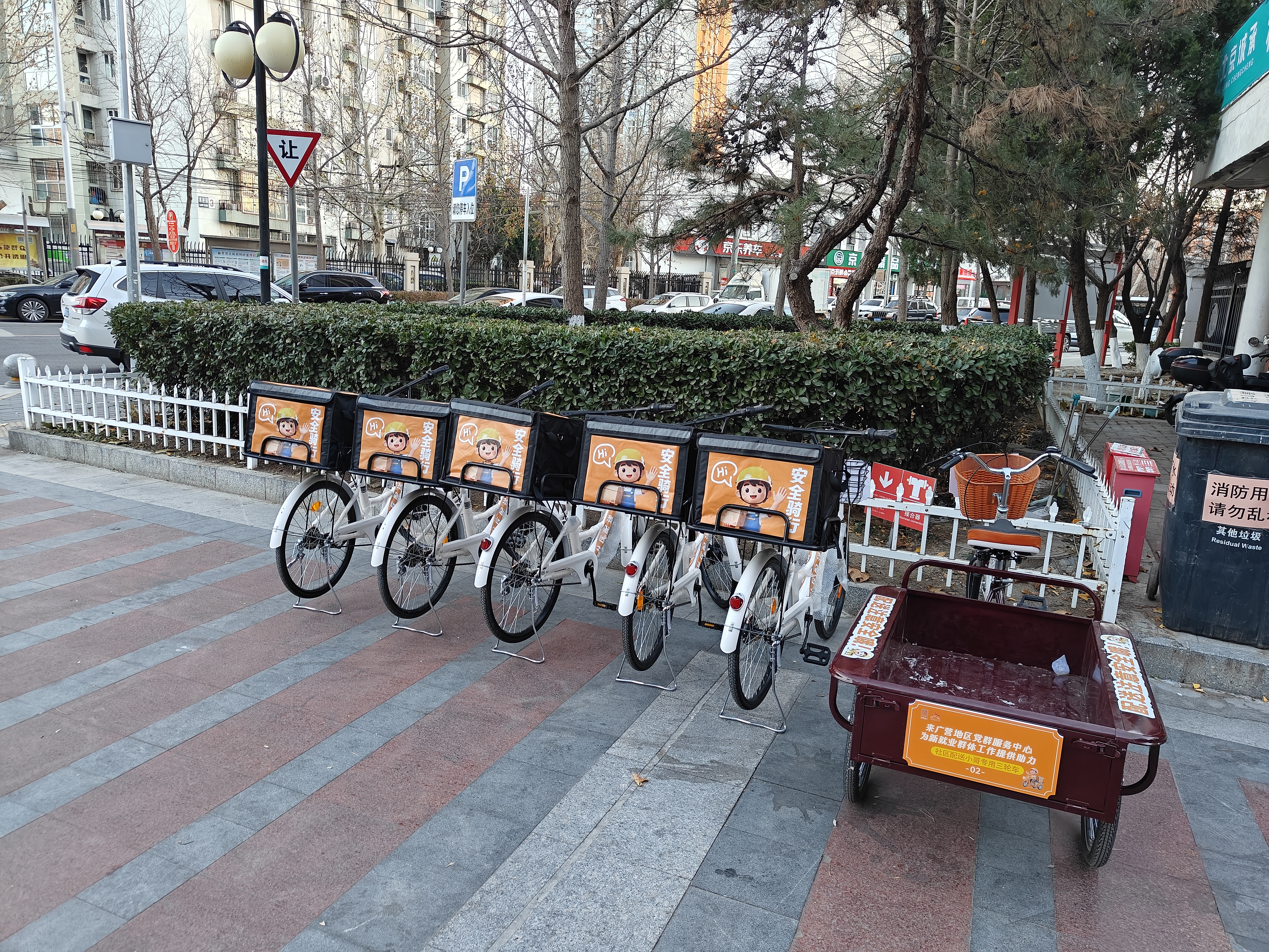 很快,首批10个试点社区迎来新变化。小区入口处,统一标识的专用小推车、自行车等整齐排列,旁侧的暖心指引牌、地图清晰醒目,成了小哥们的配送“新伙伴”。