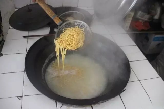 那是我第一次见到这样的古老的工具。形态古朴,像板凳一样,有四条腿,粗大的木梁中间有一个圆洞,圆洞里面镶上一块布满小孔的铁片,上面有另一条粗大木棍对准这个圆洞,可直插在圆洞中。制作饸饹时,把水烧开,把“饸饹床子”横跨在大铁锅上,把和好的荞麦面放入圆洞中,把木棍直接下压下来,像活塞似的上下运动,用力压下,面条便从小孔落入锅中,待面条煮熟后捞入碗中,浇上各种卤汁,即可食用。这就是所谓的“压饸饹”,银丝出漏长的诗句,形容的就是饸饹挤压成形时的状态。
