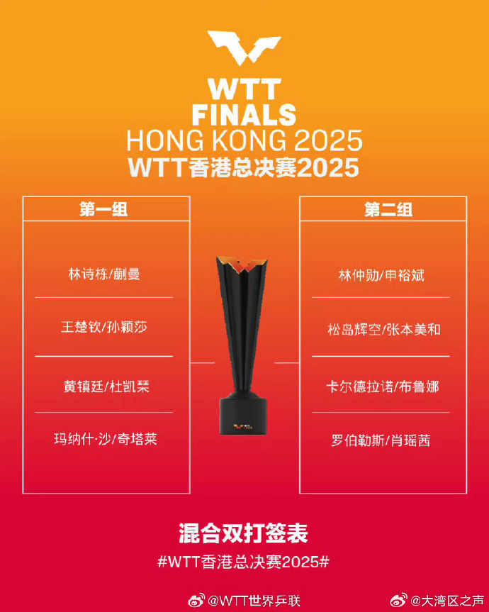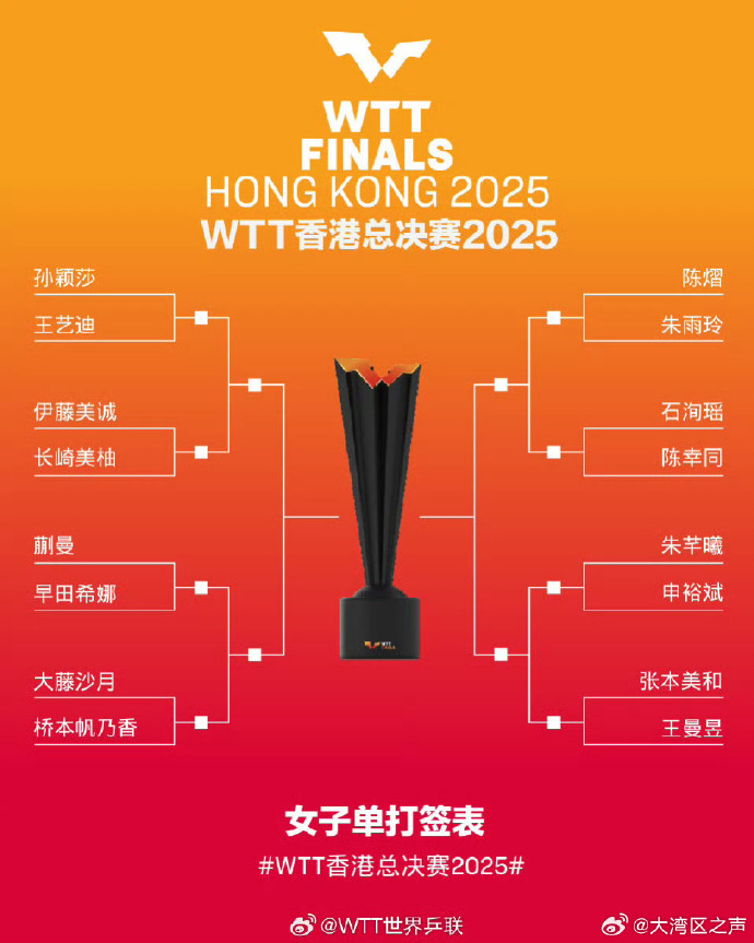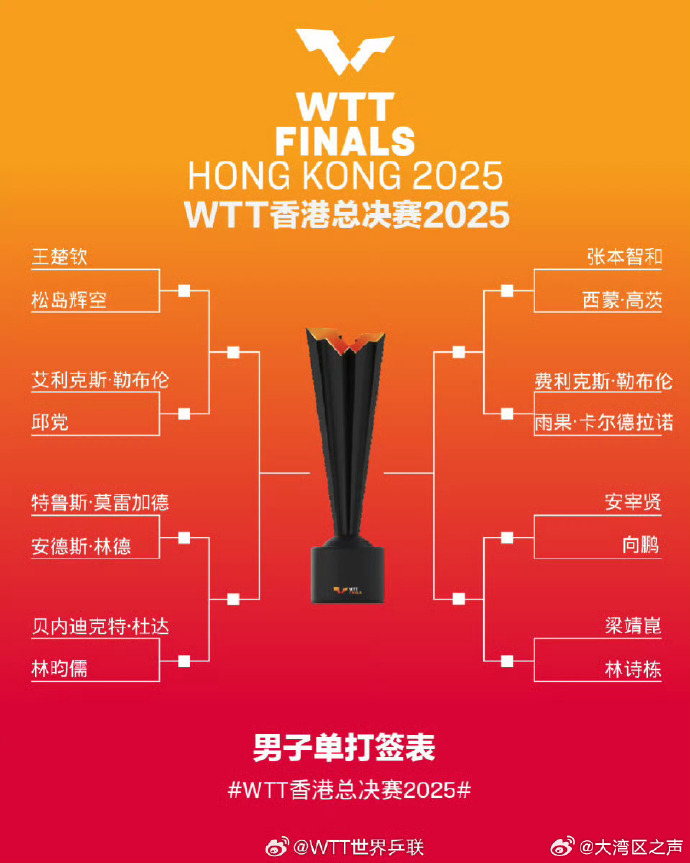 WTT香港总决赛2025抽签仪式今日(8日)举行,男子单打、女子单打、混合双打签表出炉。