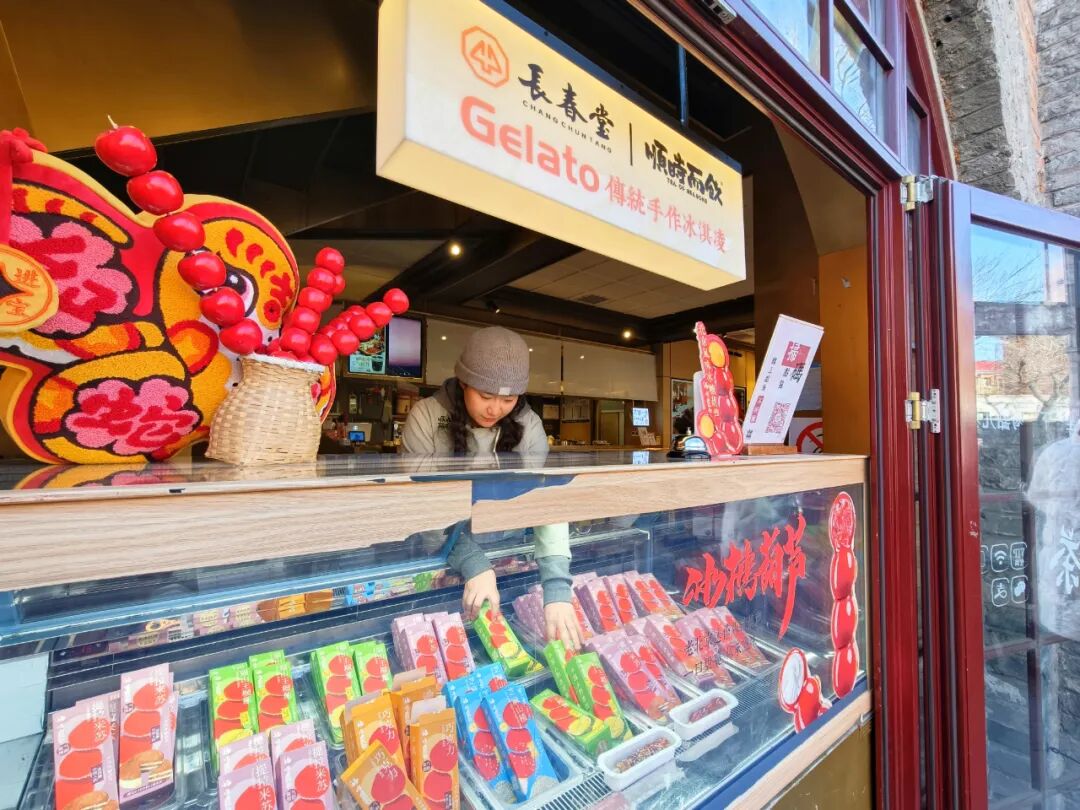 无独有偶,在顺时而饮北大红楼店,新上市的巧克力、提拉米苏、猫山王榴莲、芝麻山楂四种口味夹馅糖葫芦也凭借独特口感收获大批拥趸。“和传统糖葫芦比,我们既保留了糖壳的脆甜与山楂的清爽,又通过内馅创新实现了口味升级,一口咬下去有意想不到的惊喜。”顺时而饮北大红楼店店长满静向记者介绍道。如提拉米苏口味将意式风味融入传统小吃,咖啡的微苦、芝士的丝滑与水果的清甜形成三重味觉碰撞,深受追求精致口感的年轻客群喜爱。