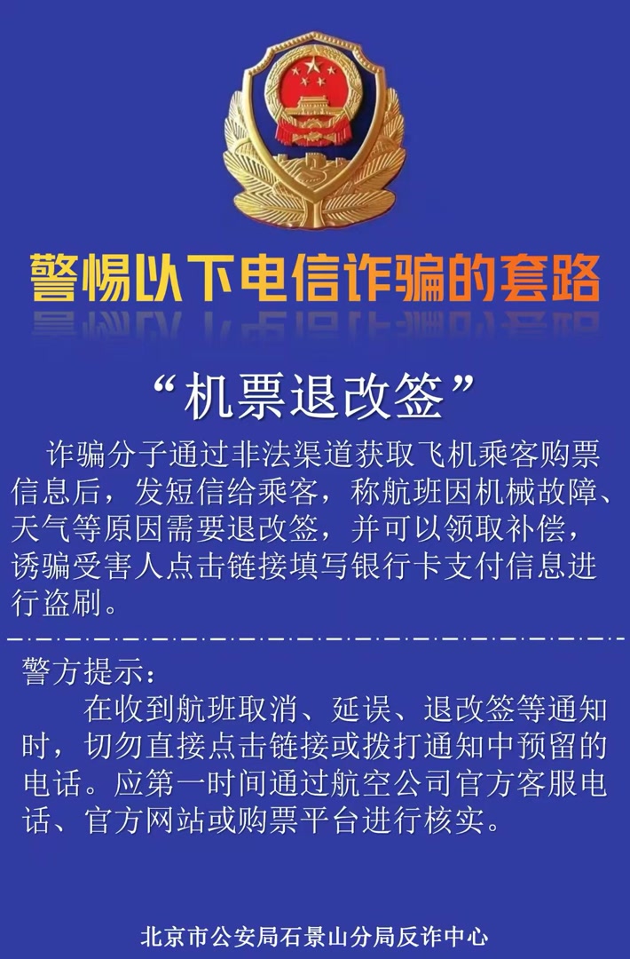 诈骗分子通过非法渠道获取飞机乘客购票信息后,发短信给乘客,称航班因机械故障、天气等原因需要退改签,并可以领取补偿,诱骗受害人点击链接填写银行卡支付信息进行盗刷。