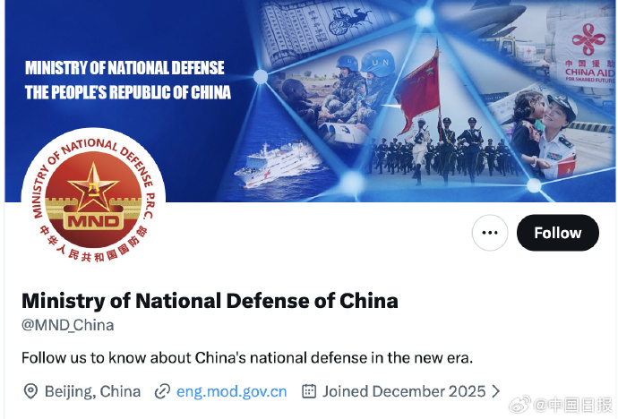 12月8日傍晚,中国国防部在海外社交媒体平台X正式开通了官方账号。账号发布了第一条英文贴文:“见证历史,我们来了。大家好!中华人民共和国国防部官方账号今天上线了。我们将通过这个平台,分享中国故事、中国军队故事。”贴文下配发了一条长约1分钟的视频,展示了中国军队演习训练、执行海外任务、参与国内应急救灾的画面。视频的英文序言说:“和平是人类的共同愿望和崇高目标。中国军队始终是维护世界和平的坚定力量。”
