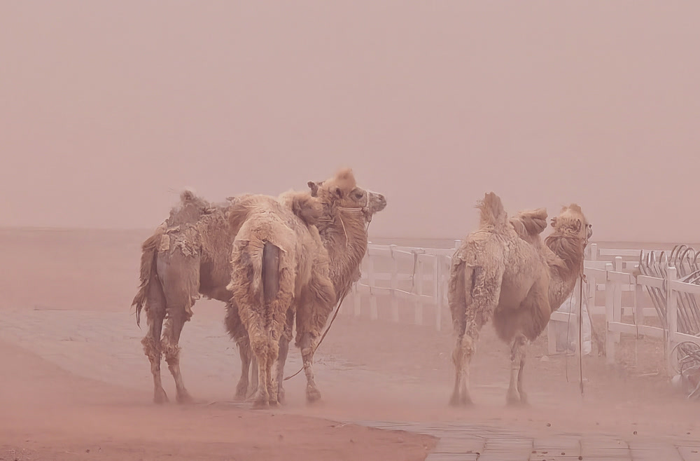 继续向前走,又拍到了沙漠中的“王子”——一群骆驼被突如其来的沙尘吹得团团转甚至发呆的镜头。