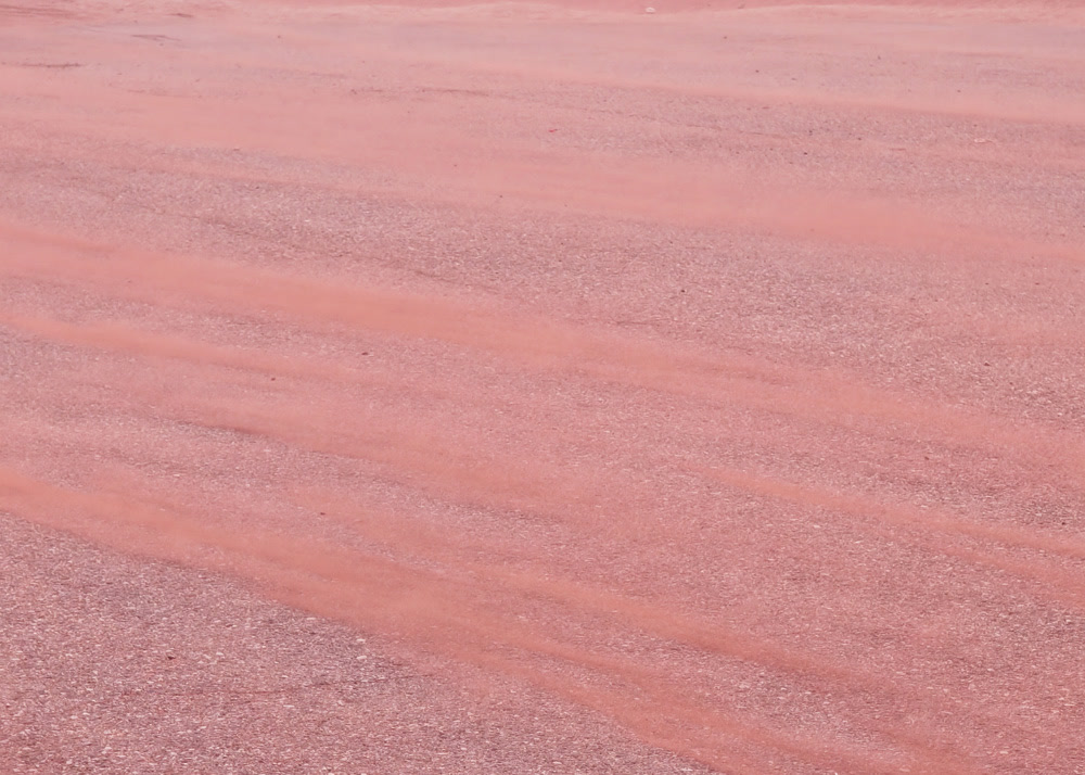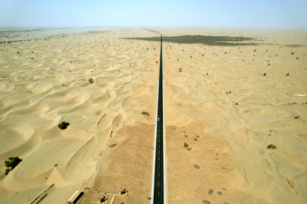 第二发现,沥青浇筑的公路上,“飞沙”正在路面上像水一样流淌着。这个也可以拍。