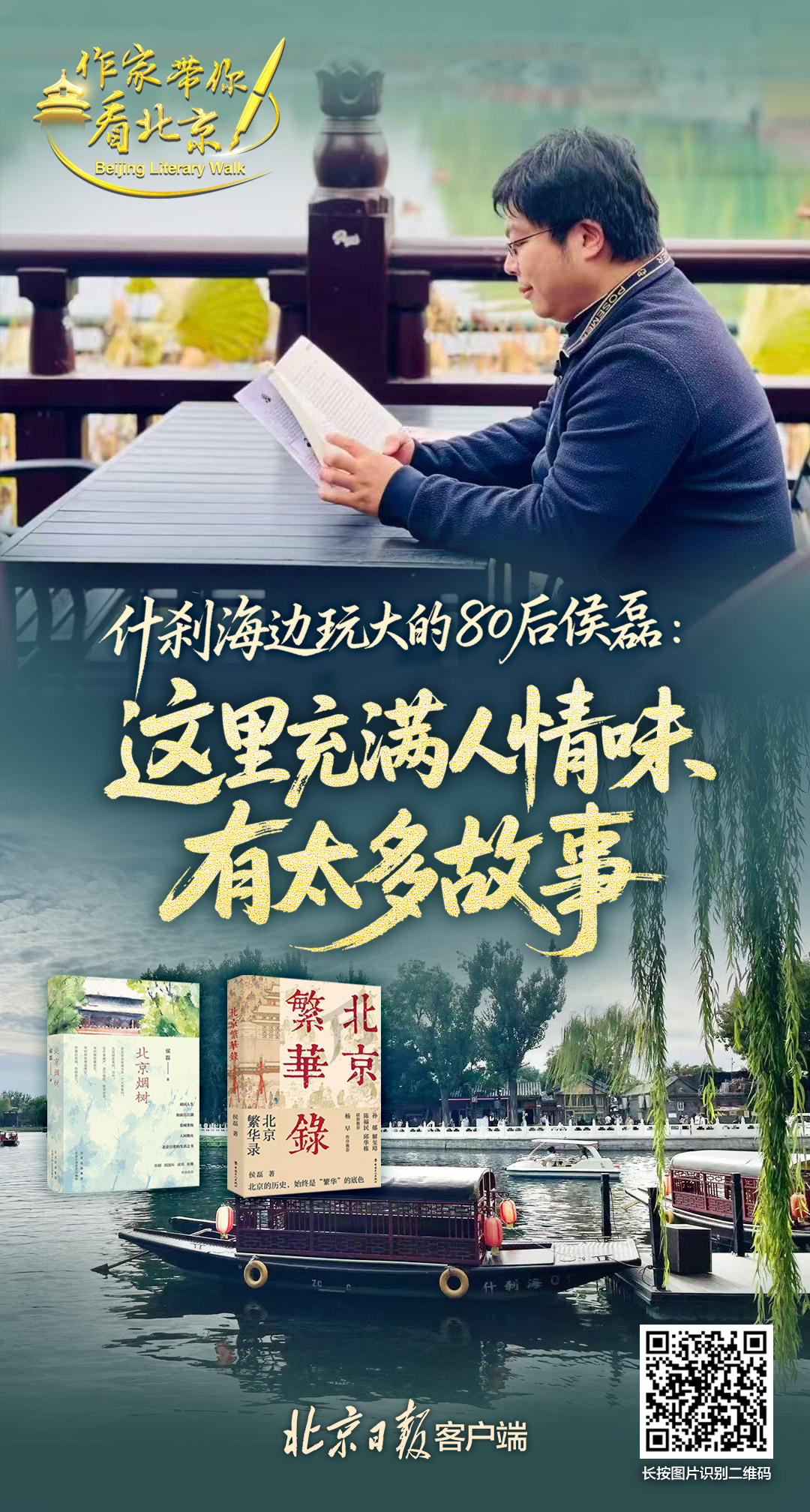 80后作家侯磊从小在什刹海边玩大,这里有他的童年记忆和家族往事,也成为滋养他创作的源泉,他说:“这里有浓浓的人情味,这里的生活细节特别感人,不论贫与富,不论身处顺境或逆境,什刹海都给了大家一个放松心灵,休闲回味,体验人生况味的空间,北京需要这样的地方。”