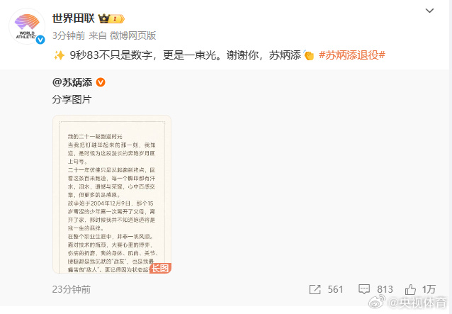 苏炳添发博正式退役后,国际田联转发微博并评论:“9秒83不只是数字,更是一束光”。谢谢苏炳添为我们带来的一个又一个巅峰冲刺。