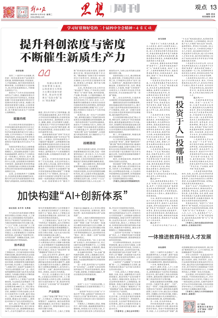 一是投资顶尖科技产业人才。“十五五”规划建议提出,统筹教育强国、科技强国、人才强国建设。顶尖科技产业人才拥有“独木成林”的效果,能够带团队、带项目乃至集聚一批上下游产业链人才。可加强顶尖科技产业人才招引,通过颠覆性创新在下一代竞技场中占得先机;建立重点领域人才需求目录,着力吸引拥有核心知识产权的全球顶尖科学家在沪开展颠覆性技术创新。