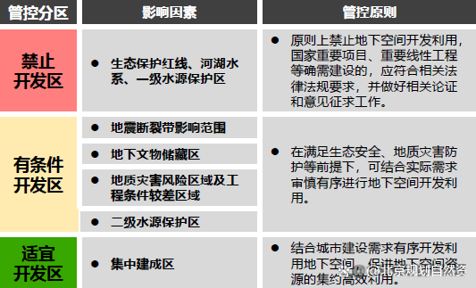禁止开发区:主要涉及生态保护红线、河湖水系及一级水源保护区。原则上禁止一切地下空间开发活动。如确需建设,须严格依法履行论证与审批程序。