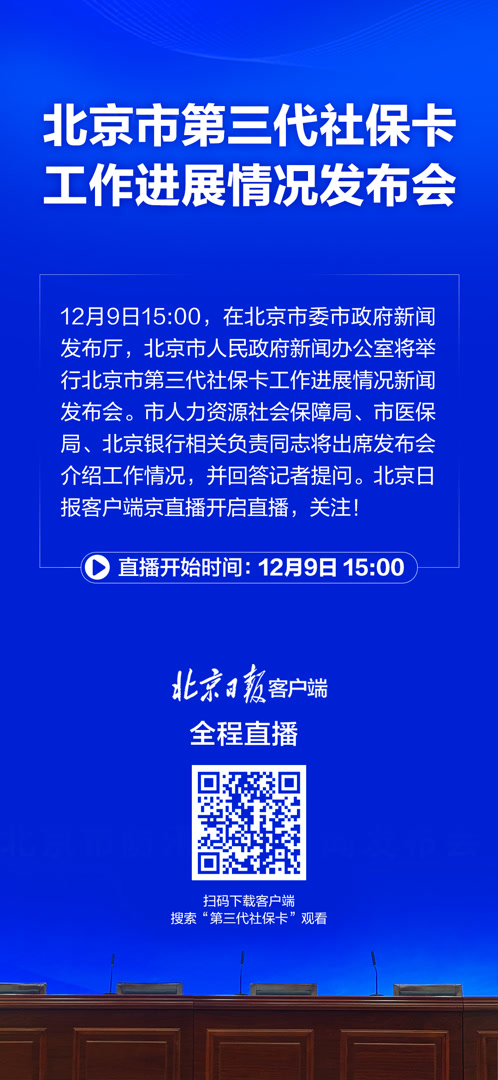 12月9日15:00,在北京市委市政府新闻发布厅,北京市人民政府新闻办公室将举行北京市第三代社保卡工作进展情况新闻发布会。市人力资源社会保障局、市医保局、北京银行相关负责同志将出席发布会介绍工作情况,并回答记者提问。北京日报客户端京直播开启直播,关注!
