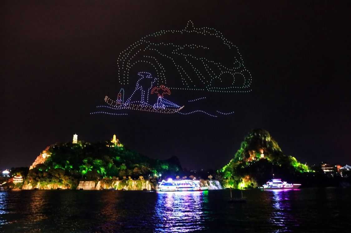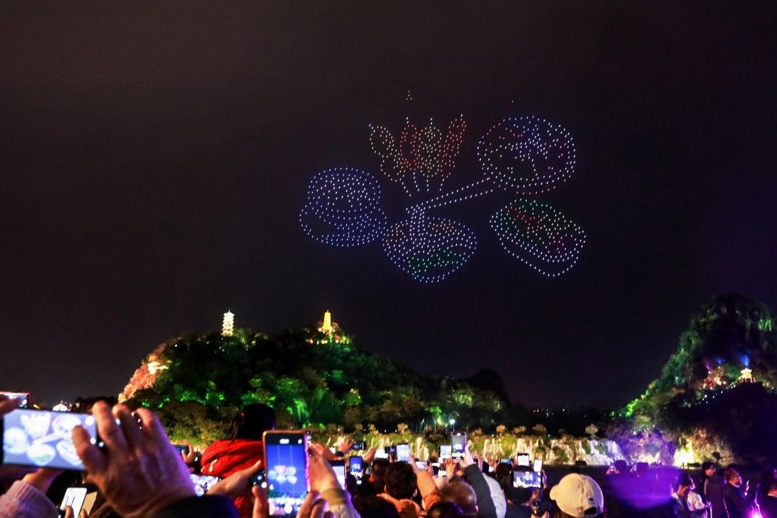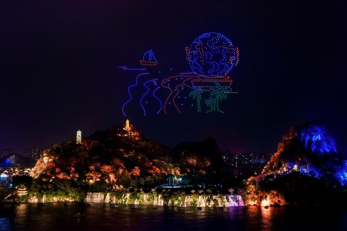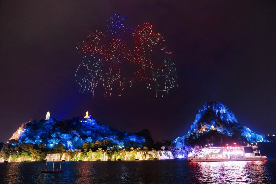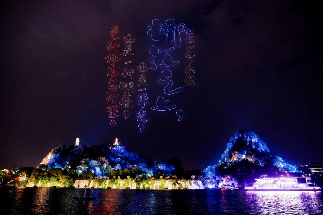 3000架无人机腾空而起,将获奖作品中广西的山水、烟火与人文,一笔一划绘入星河。