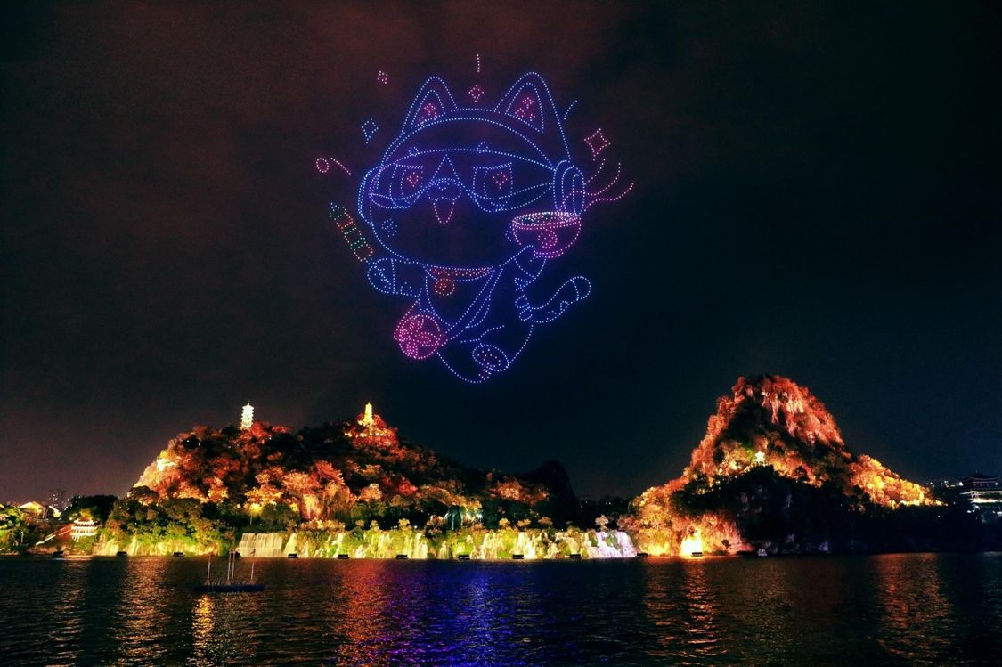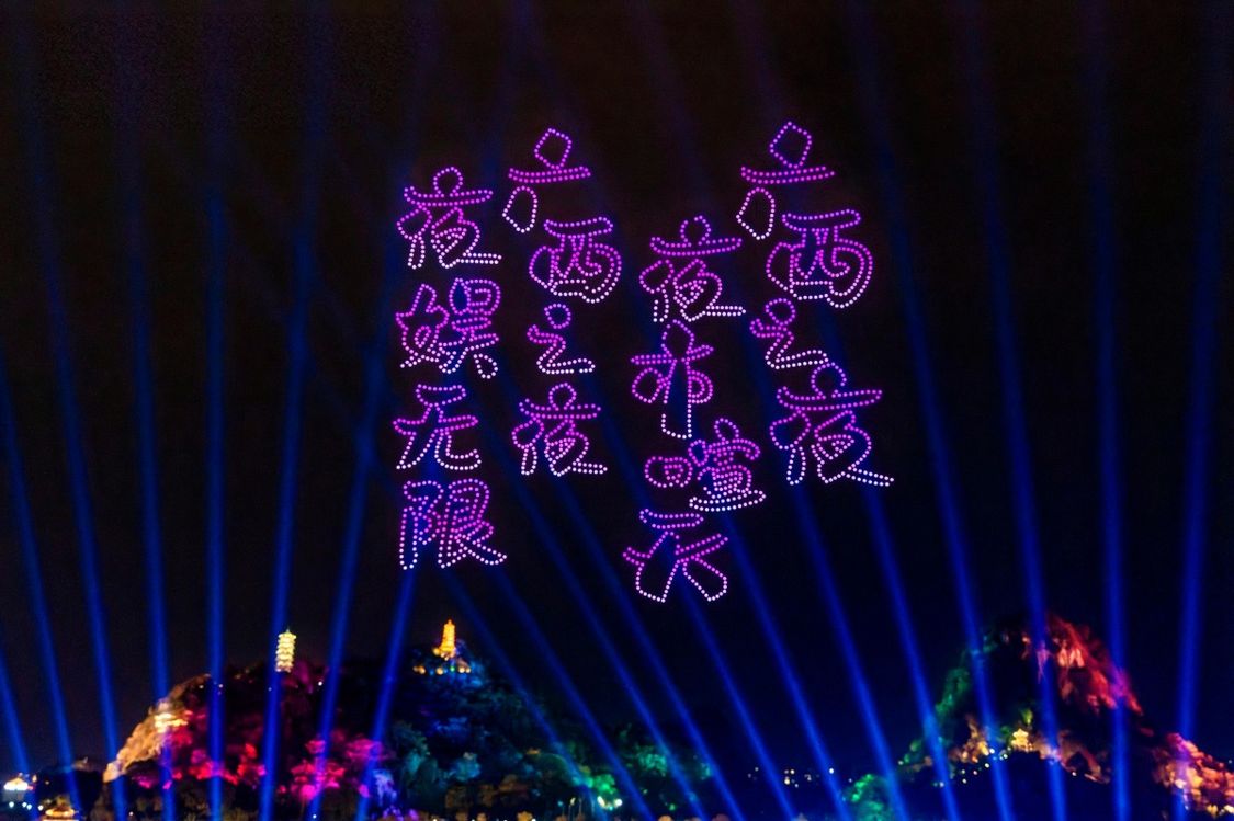 投稿中被多次提及的广西夜游景点、美味小吃,以及大赛获奖作品中的部分佳句、广西地标,通过无人机编队进行了生动展示。