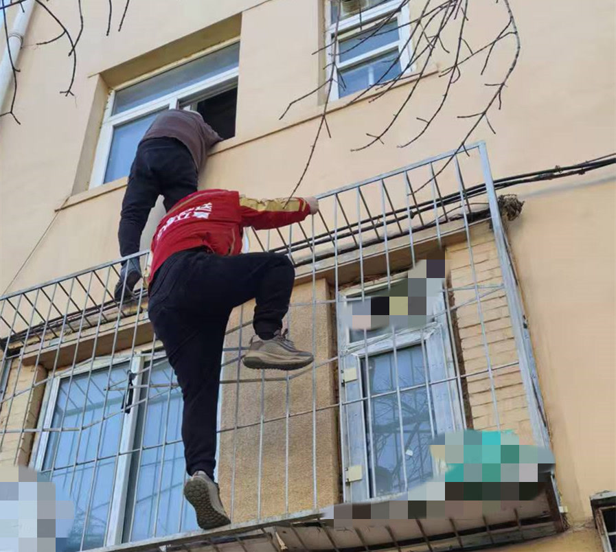 就在这千钧一发之际,一位路过的京东快递小哥见状,毫不犹豫冲到楼下。他身手敏捷,借助外墙护网和窗台迅速攀爬至老人身边。小哥先是尝试托举老人入室,但因护网难以着力未能成功。危急关头,他果断改变策略,用身体紧紧护住老人,充当临时支撑,并不断安慰:“抱紧我,坚持住!”这一举动有效缓解了老人的体力消耗与恐慌,为后续救援争取了宝贵时间。